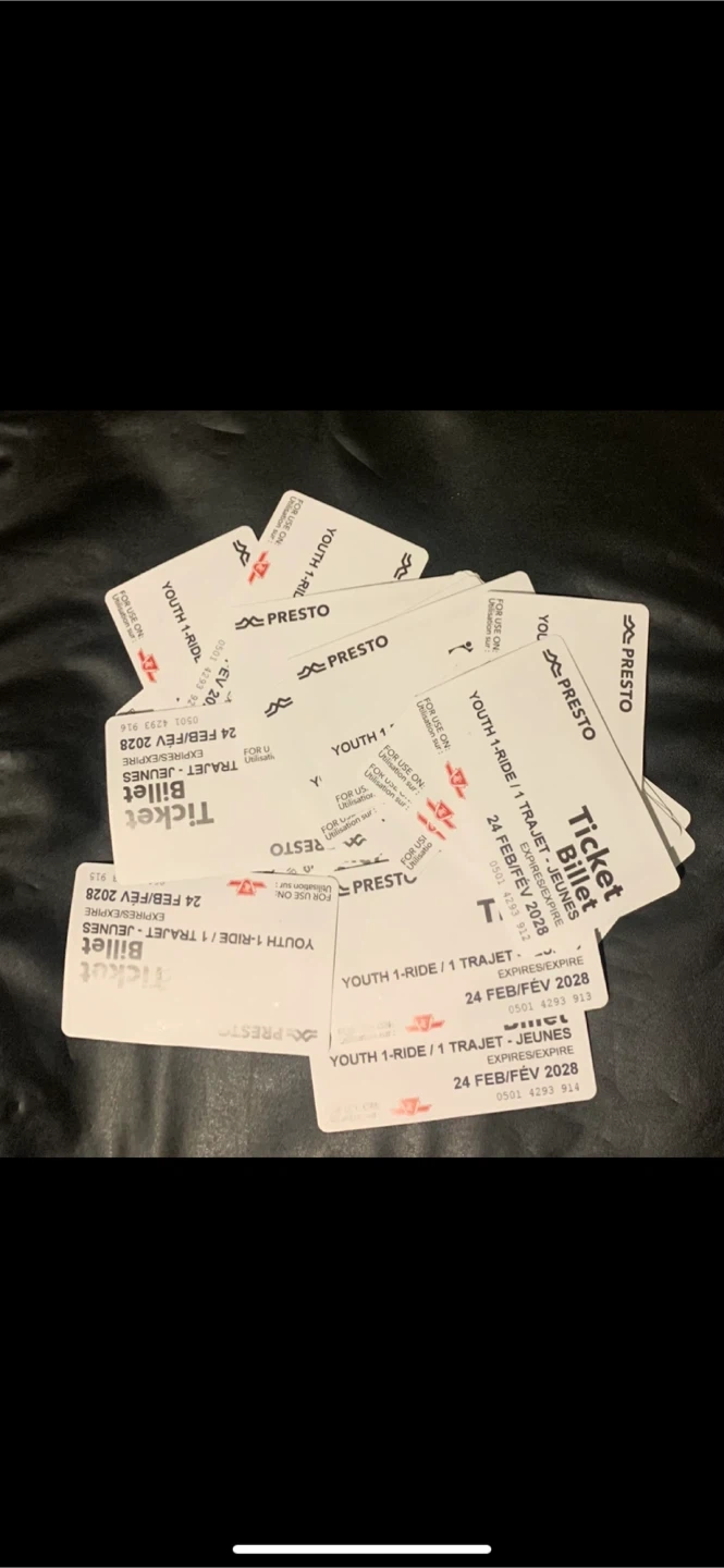 Buy & SellPresto Youth 1-Ride Tickets (Expires Feb 2028)Presto Youth 1-Ride Tickets (Expires Feb 2028)$2Bundle of Presto youth 1-ride tickets. 40 tickets for $60ConditionNewWHERE TO MEETCheck LocationView MapSELLERTADownsview444 reviews2 chats·0 favorites·36 viewsSEND CHAT TO SELLERHi TA! I’m interested in your listing.Hi TA! I’m interested in your listing.Get the Karrot app to chatSign In to chat