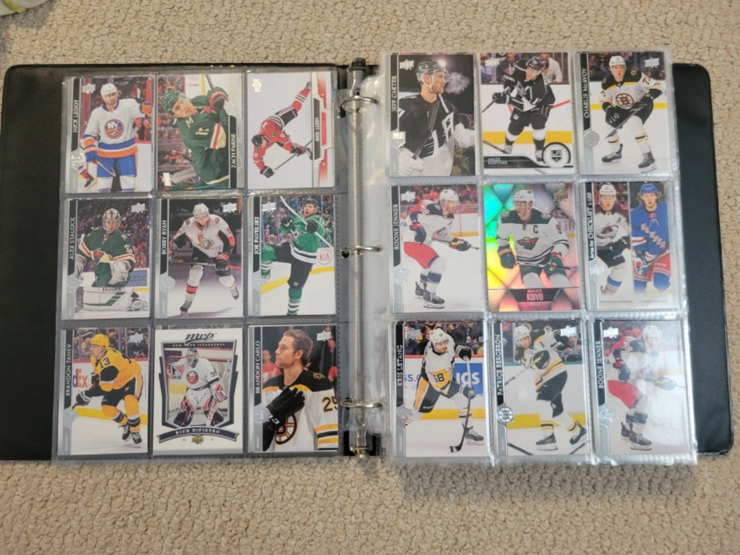 •lots of star players in binder, Brad Marchand, Alex Ovechin, Evgeni Malkin, Nicklas Backstrom, Blake Wheeler, Matthew Tkachuk, Steven Stamkos, Matthew Tkachuk, Patrice Bergeron, Dylan Larkin, Mark Scheifele, Anze Kopitar, Bo Horvat, Taylor Hall, Ryan O'Reilly, Brayden Point, Jordan Binnington, Victor Hedman, Mika Zibanejad, David Pastrnak, John Tavares, Marc-Andre Fleury, Charlie McAvoy, Filip Forsberg, Nathan MacKinnon, Artemi Panarin, Shea Weber, Drew Doughty, Robert Thomas, Matt Murray, Tuukka Rask, Henrik Zetterberg, Joe Thornton, Roberto Luongo, Jonathan Toews, Patrick Marleau, Joe Pavelski and many more