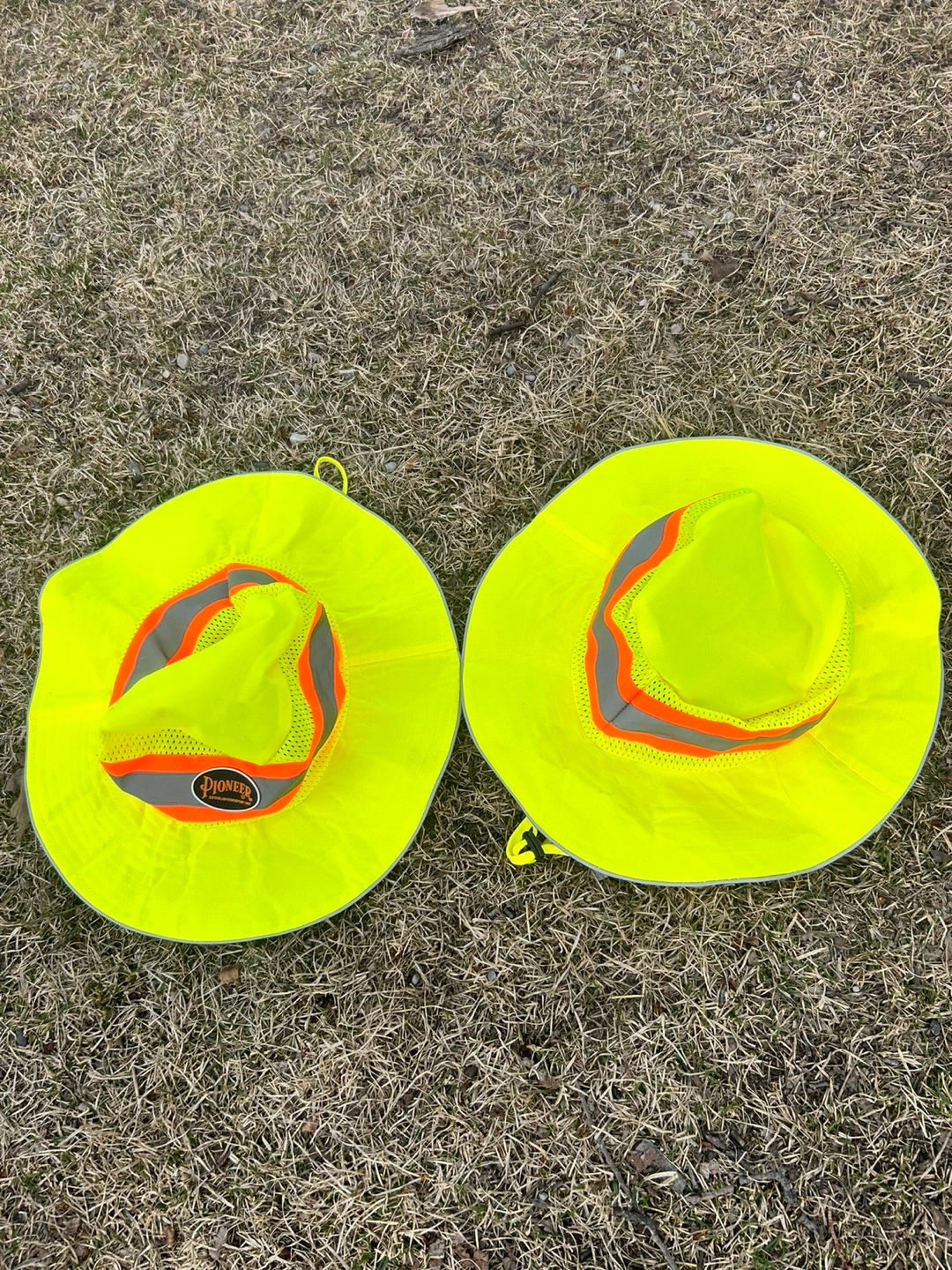 Two bright yellow sun hats. Great for outdoor work or visibility. Mesh interior for breathability. Adjustable chin straps.