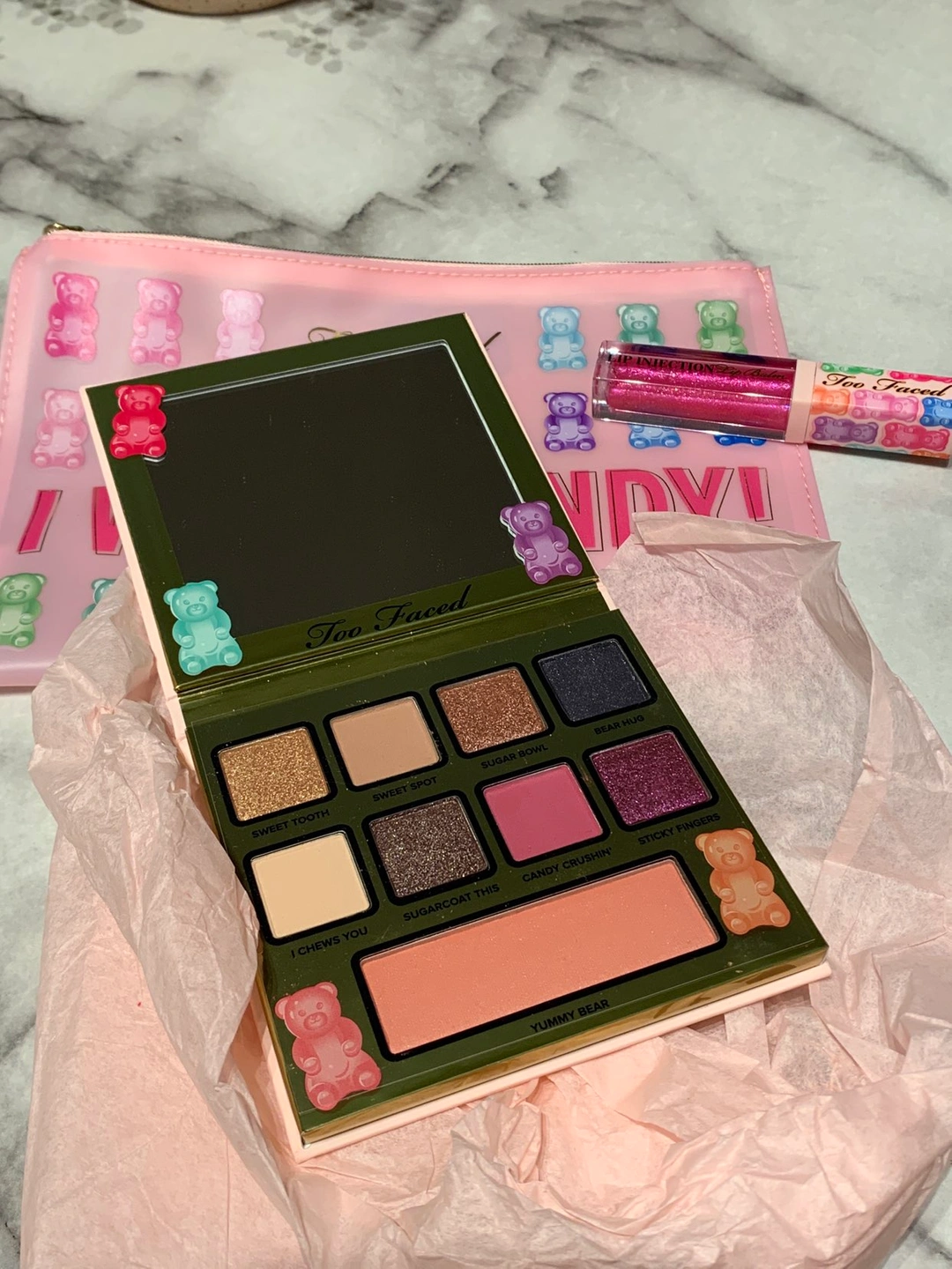75Brand new Too Faced Limited Edition YUMMY GUMMY Set, never used before. Comes with eyeshadow palette, make up pouch and a lip plumping lipgloss.