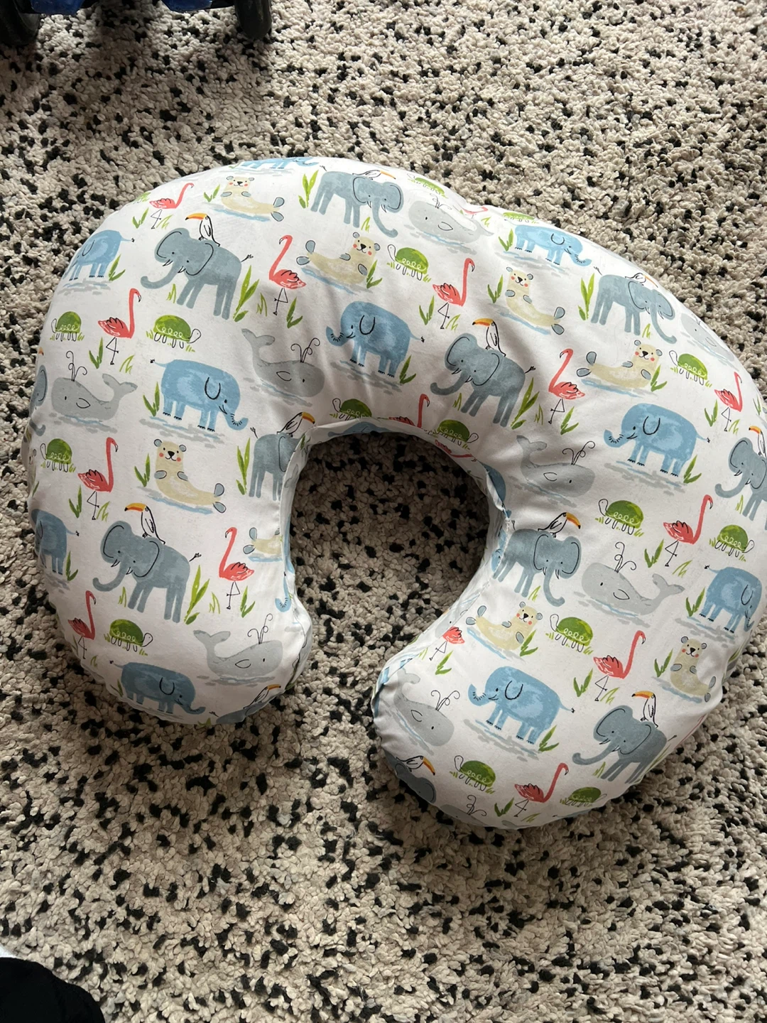 This U-shaped nursing pillow features a playful print with elephants, flamingos, and other animals. It's designed to provide support during feeding. The cover is removable for easy washing.