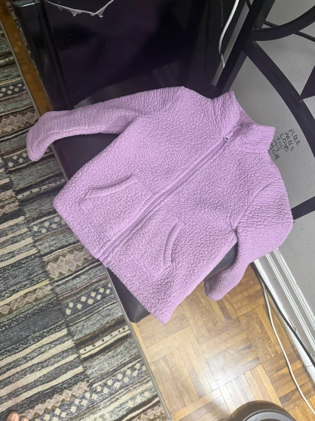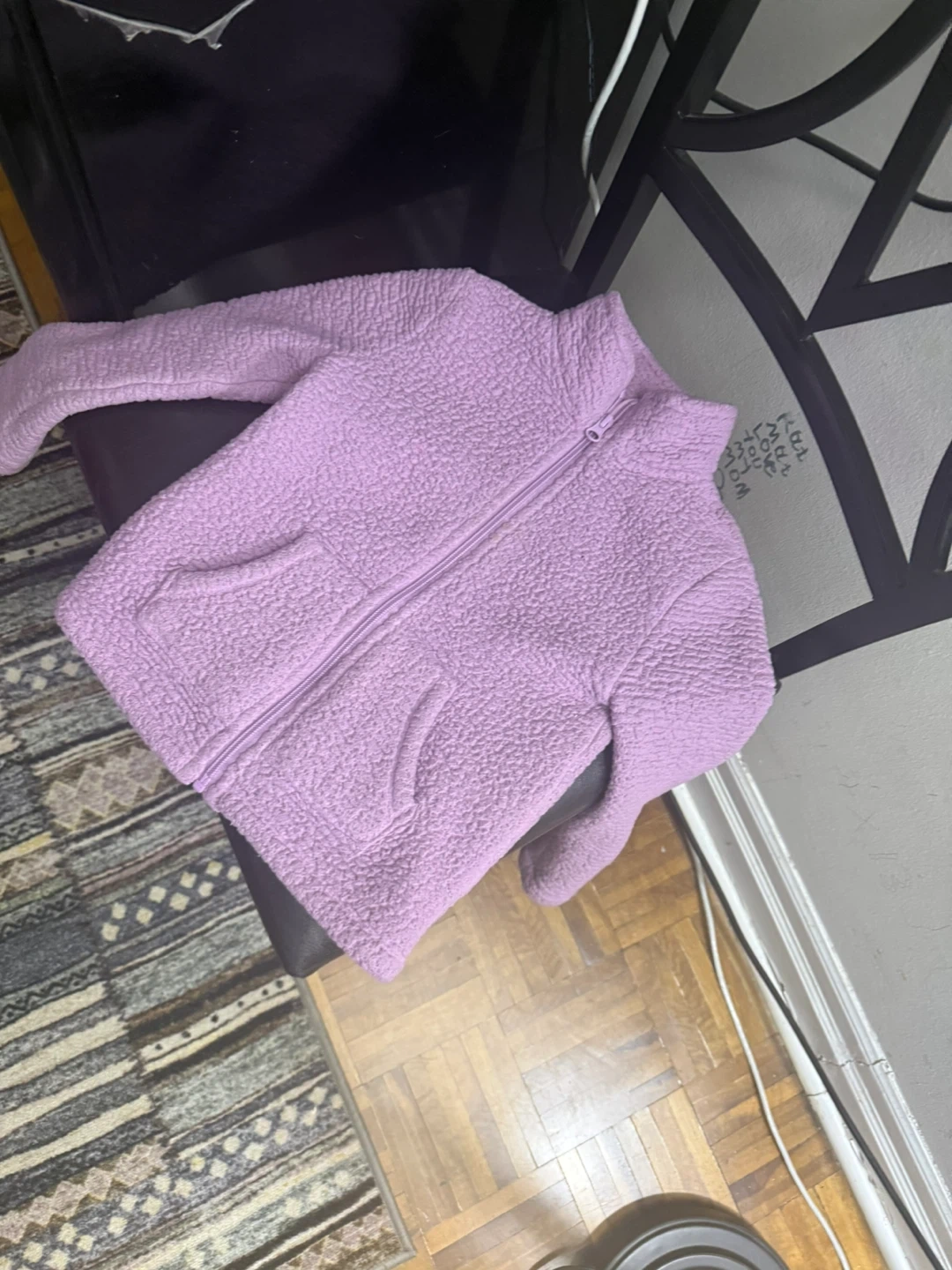Cozy lilac fleece zip-up jacket with two front pockets. It's a comfortable layering piece for cooler weather. Material is polyester.