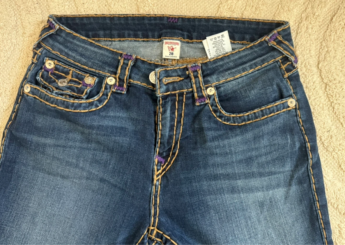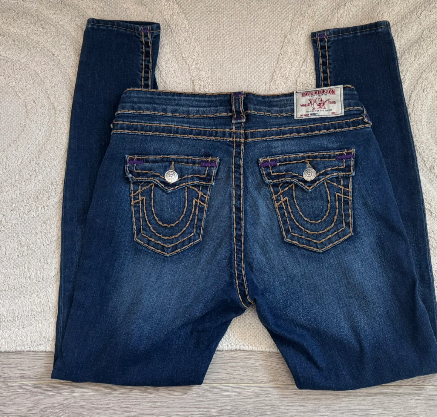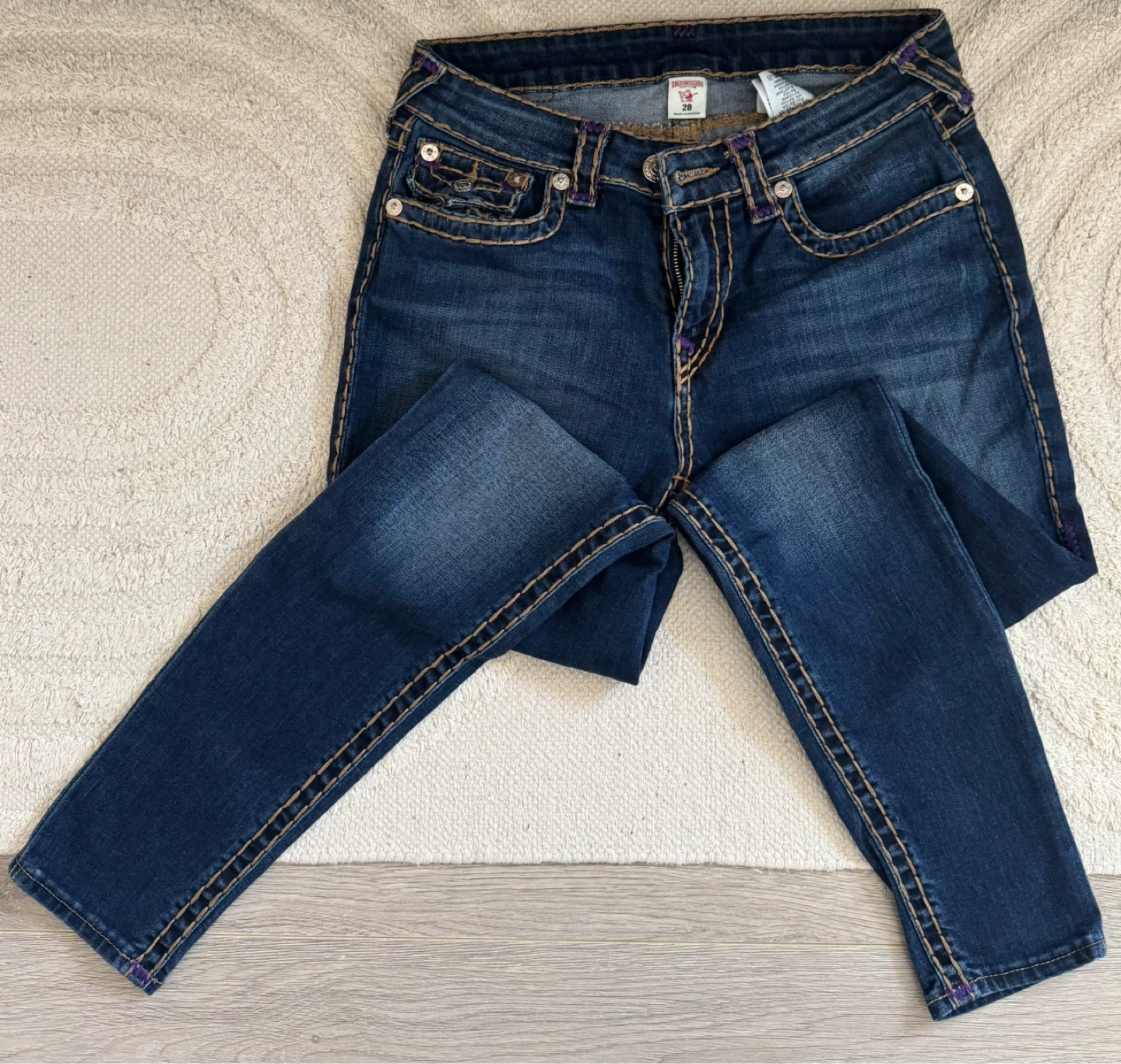 Classic True Religion skinny jeans in a dark wash. These are size 28 and made in Mexico. They feature the iconic stitch detailing.