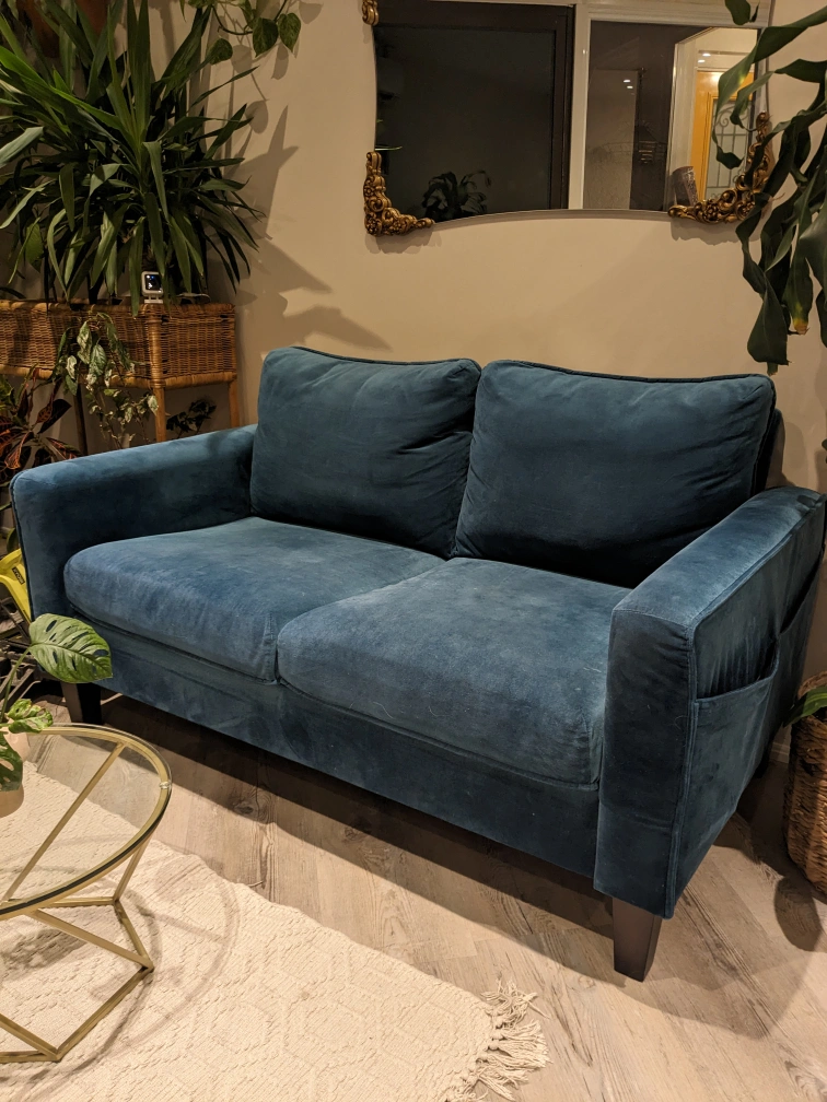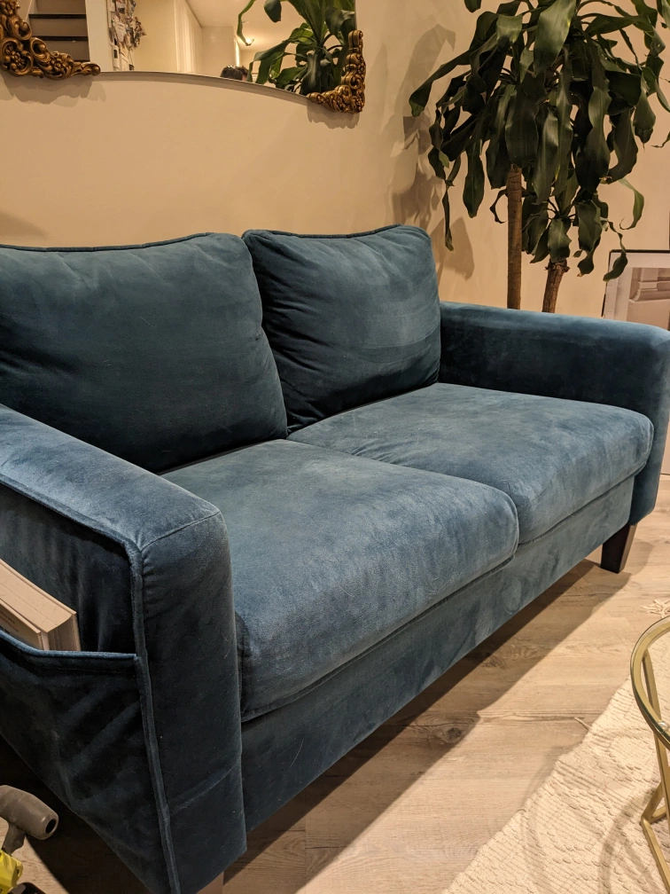 Blue Velvet couch with side pockets. In good condition from a non smoking home.