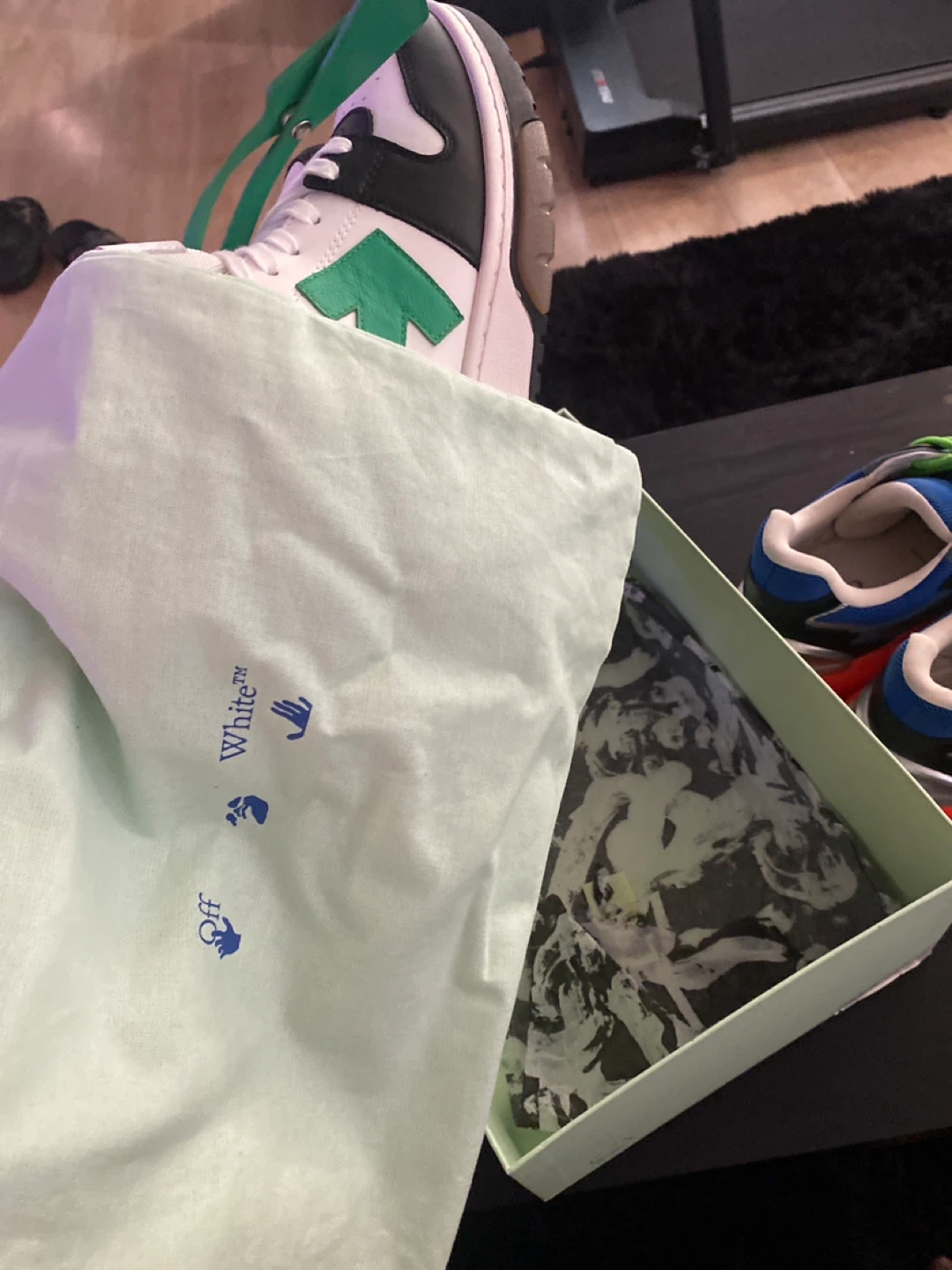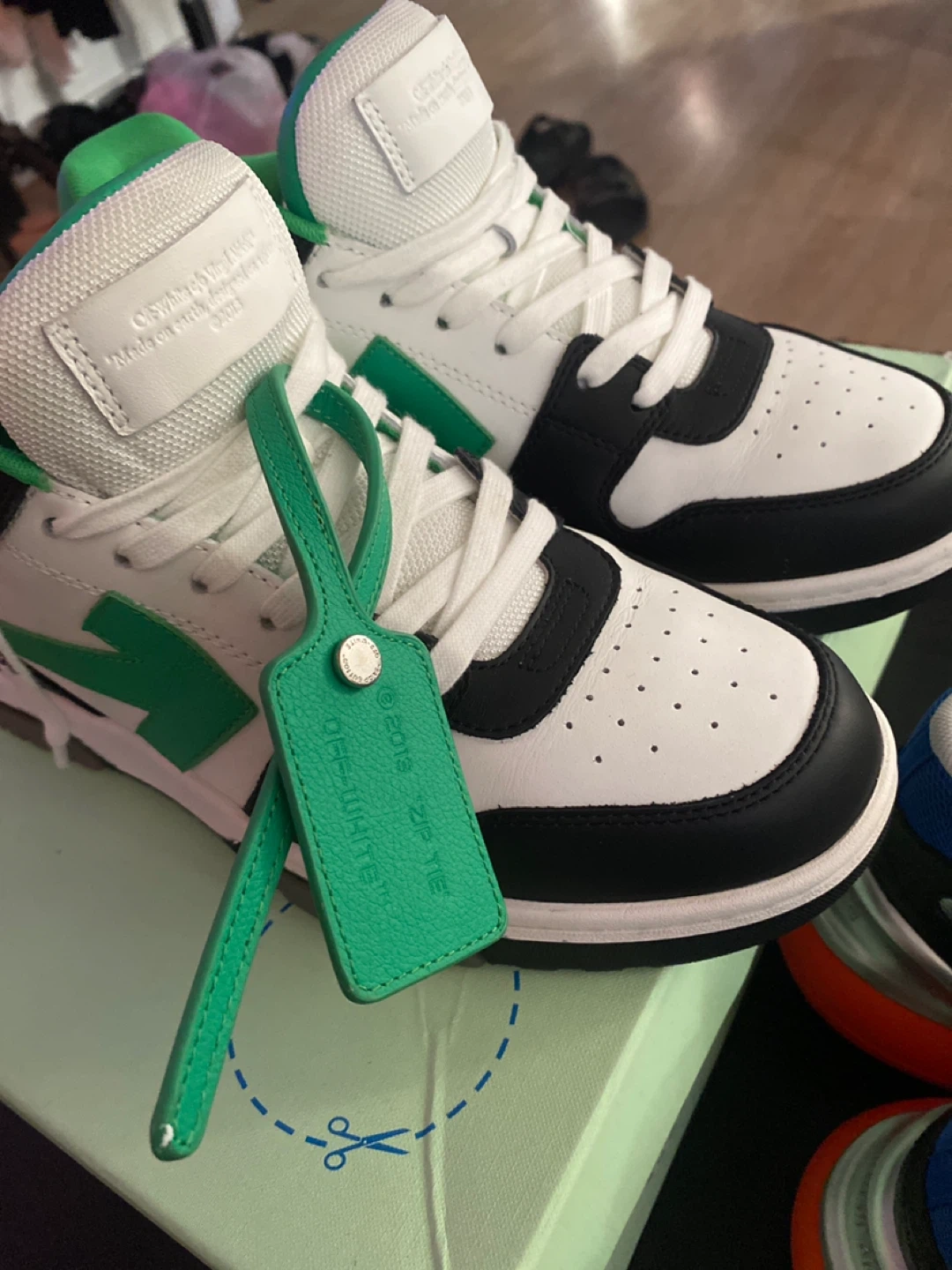 Selling a pair of Black and green Off-White Out Of Office sneakers! They come with the box only worn twice💯 retail price 650$
