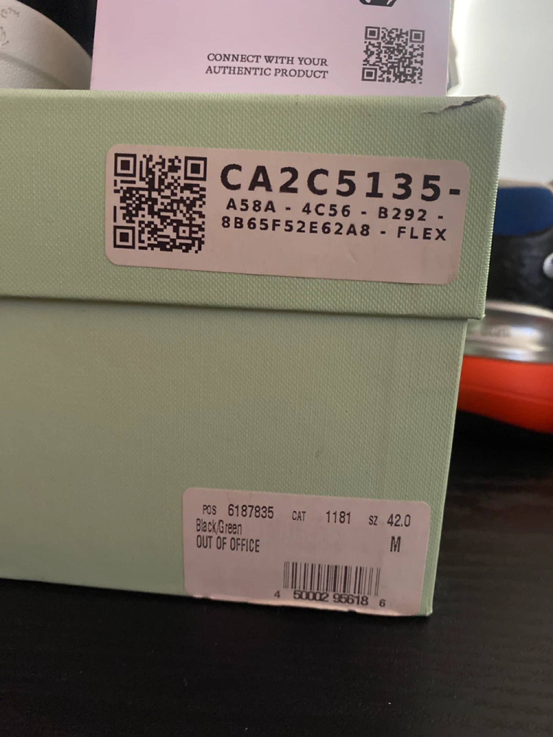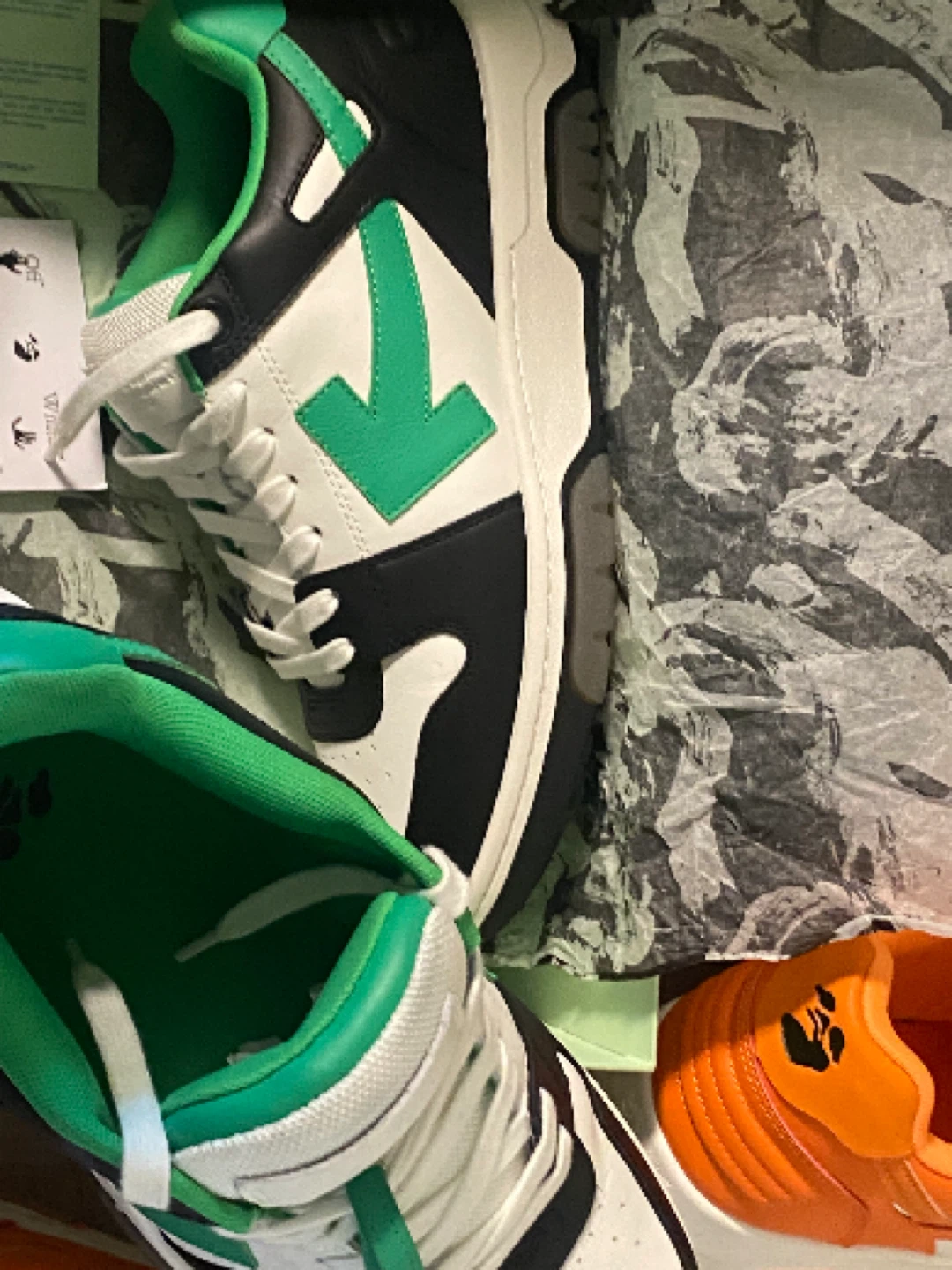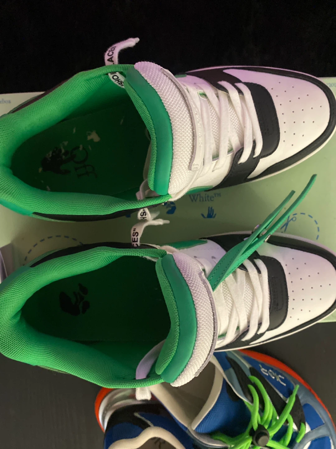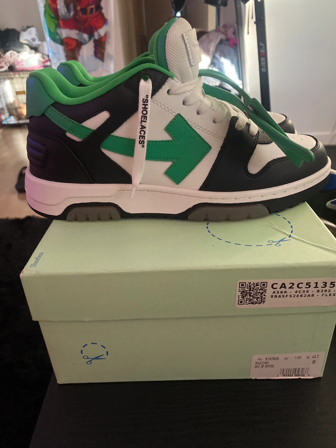 Selling a pair of Black and green Off-White Out Of Office sneakers! They come with the box only worn twice💯 retail price 650$