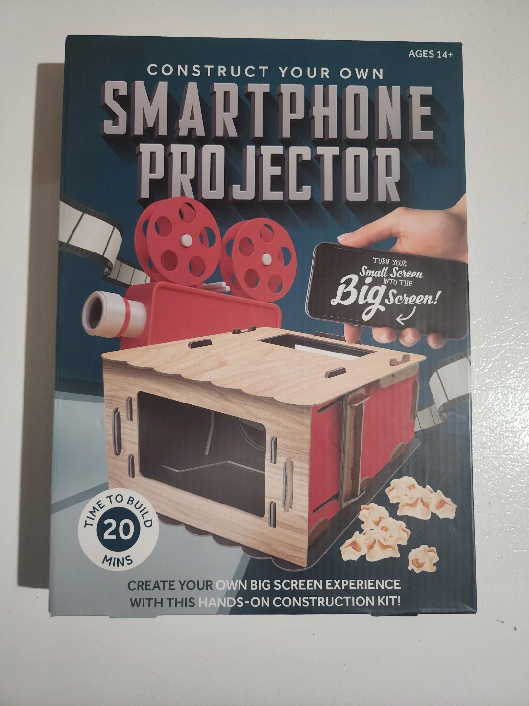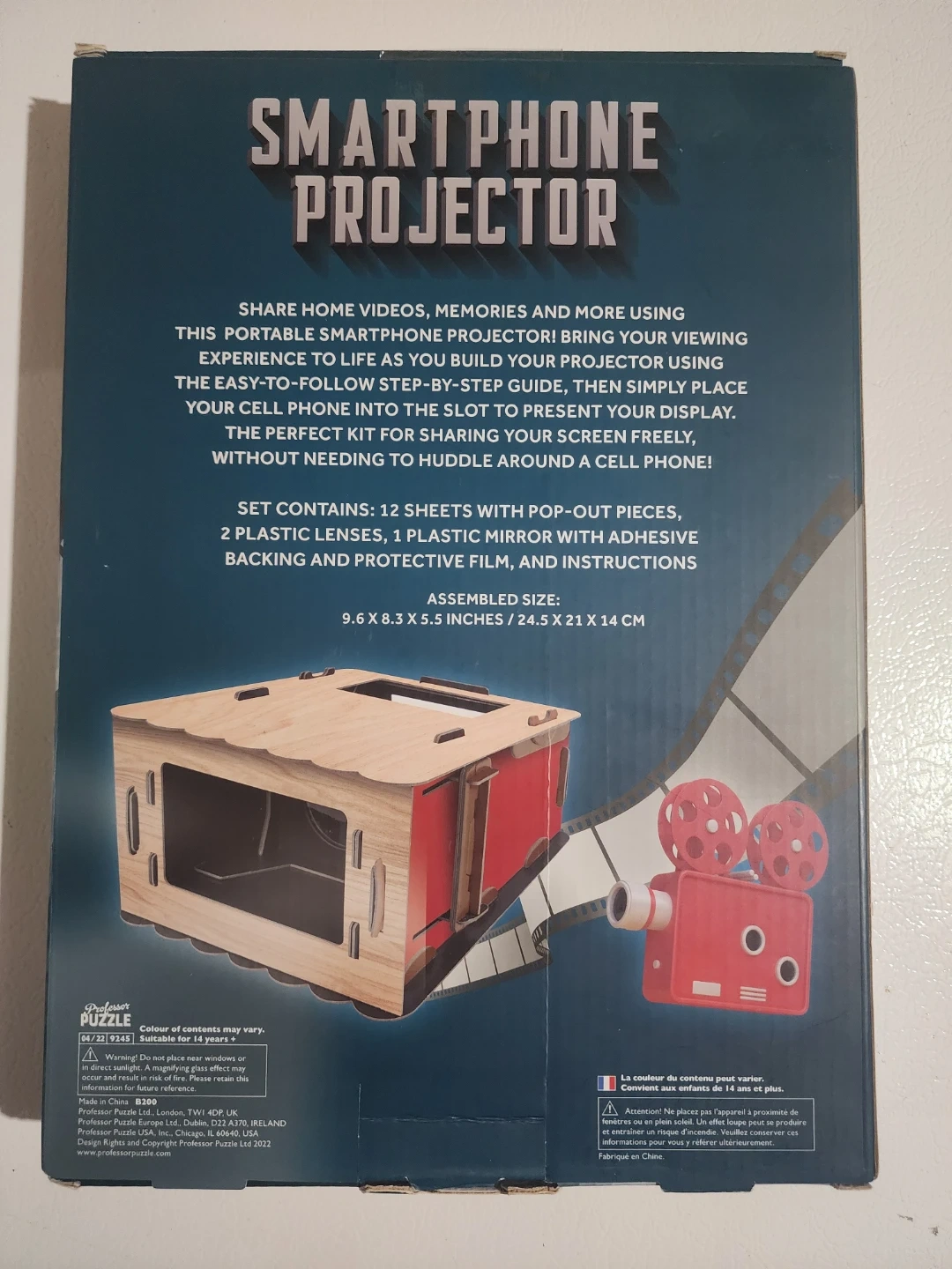Unleash a big screen experience with this construct-your-own Smartphone Projector! This hands-on construction kit allows you to create your own big screen experience from your smartphone. The box includes 12 sheets with pop-out pieces, 2 plastic lenses, 1 plastic mirror with adhesive backing and protective film, and instructions. Assembled, it measures 9.6 x 8.3 x 5.5 inches (24.5 x 21 x 14 cm). The box is in excellent condition.