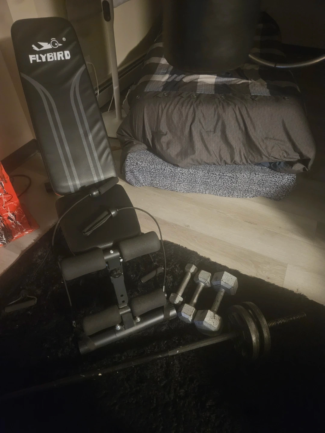 This is a FLYBIRD adjustable weight bench set, including dumbbells and a barbell. It's designed for versatile strength training exercises. The bench offers multiple incline positions for a full-body workout. Foldable apartment size with resistance bands that come with it.Some steel free weights.