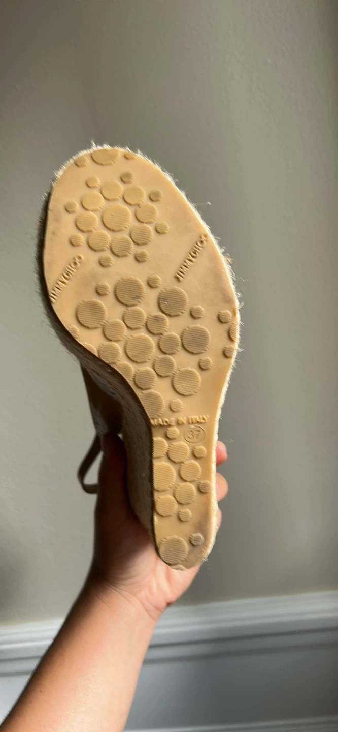 Selling a pair of Jimmy Choo espadrille wedge heels. They are a beige colour and size 37, which is approximately a size 7 in American/Canadian sizing. They are in good condition!