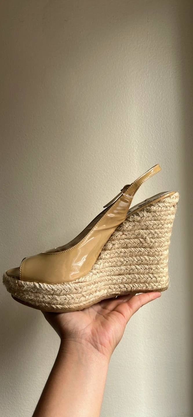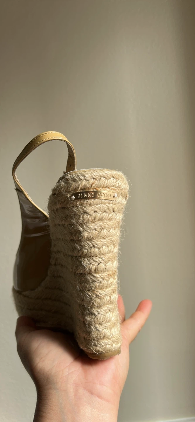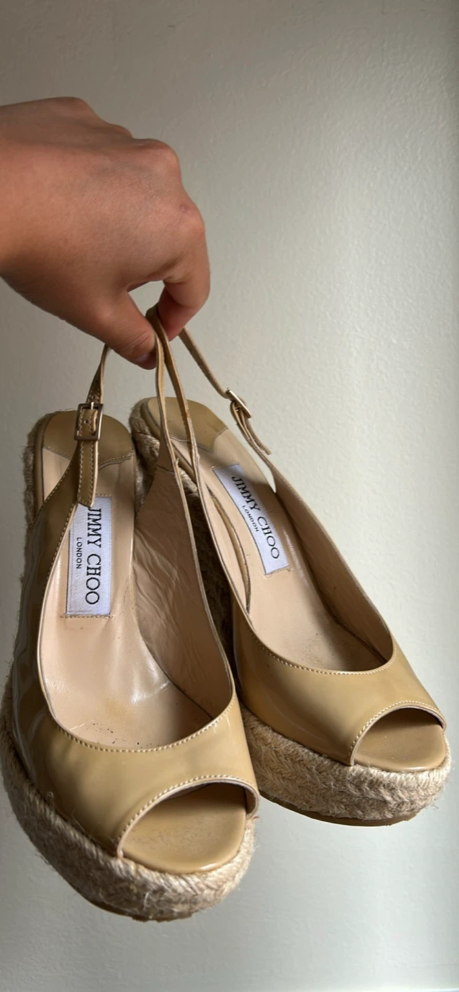 Selling a pair of Jimmy Choo espadrille wedge heels. They are a beige colour and size 37, which is approximately a size 7 in American/Canadian sizing. They are in good condition!