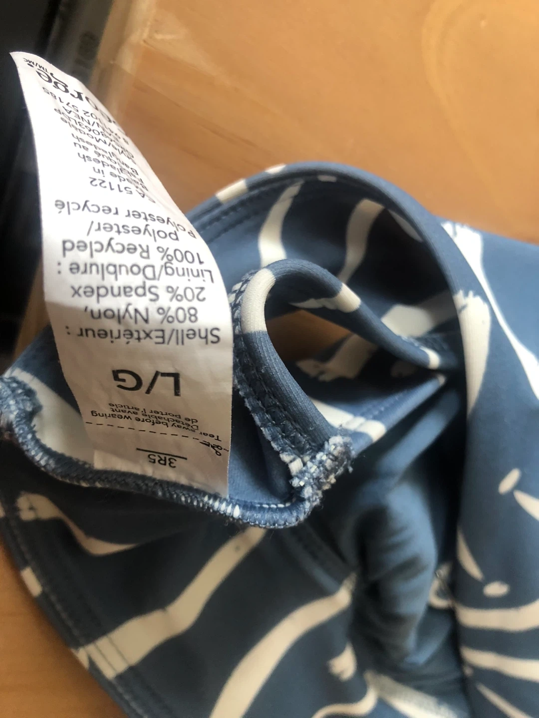 Shell/Extérieur: 80% Nylon, 20% Spandex. Lining/Doublure: 100% Recycled Polyester. This is a size large.
