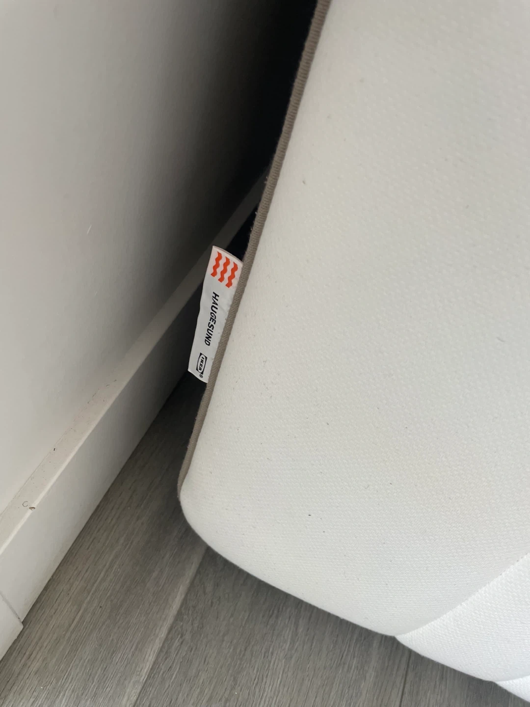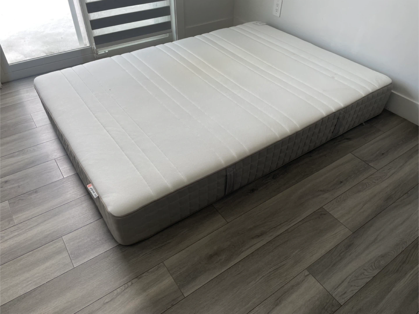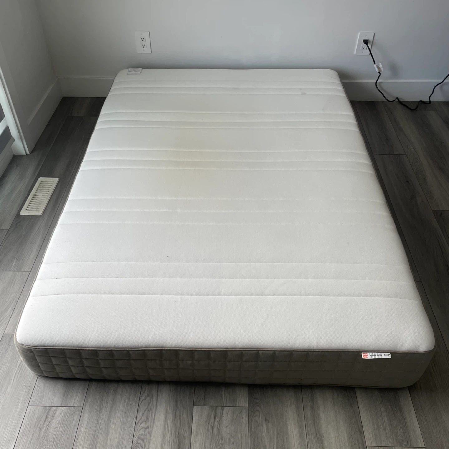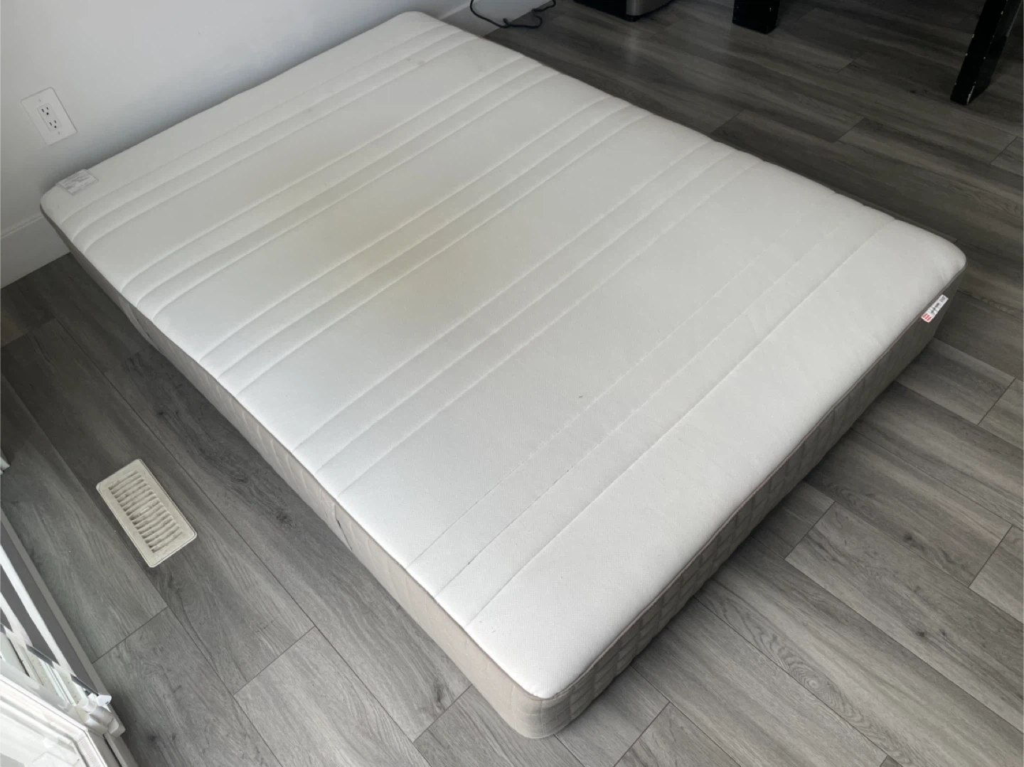 IKEA HAUGEBUND Mattress. It's In Good Condition But Has Wear As Shown, Has A Grey and white Color Scheme.