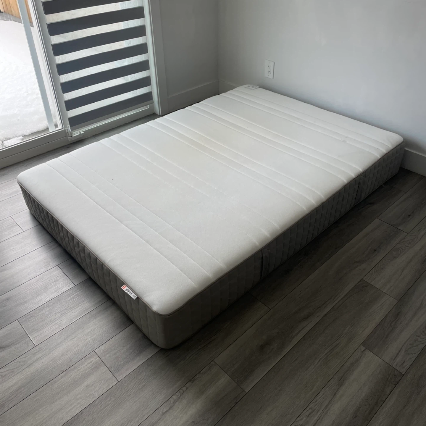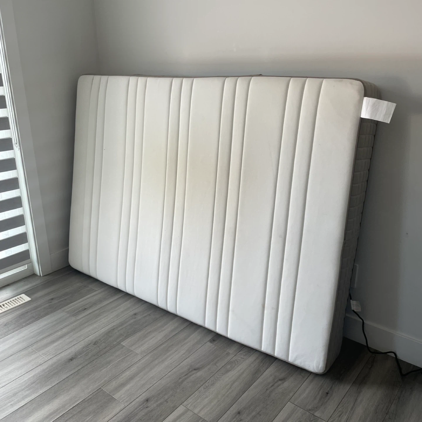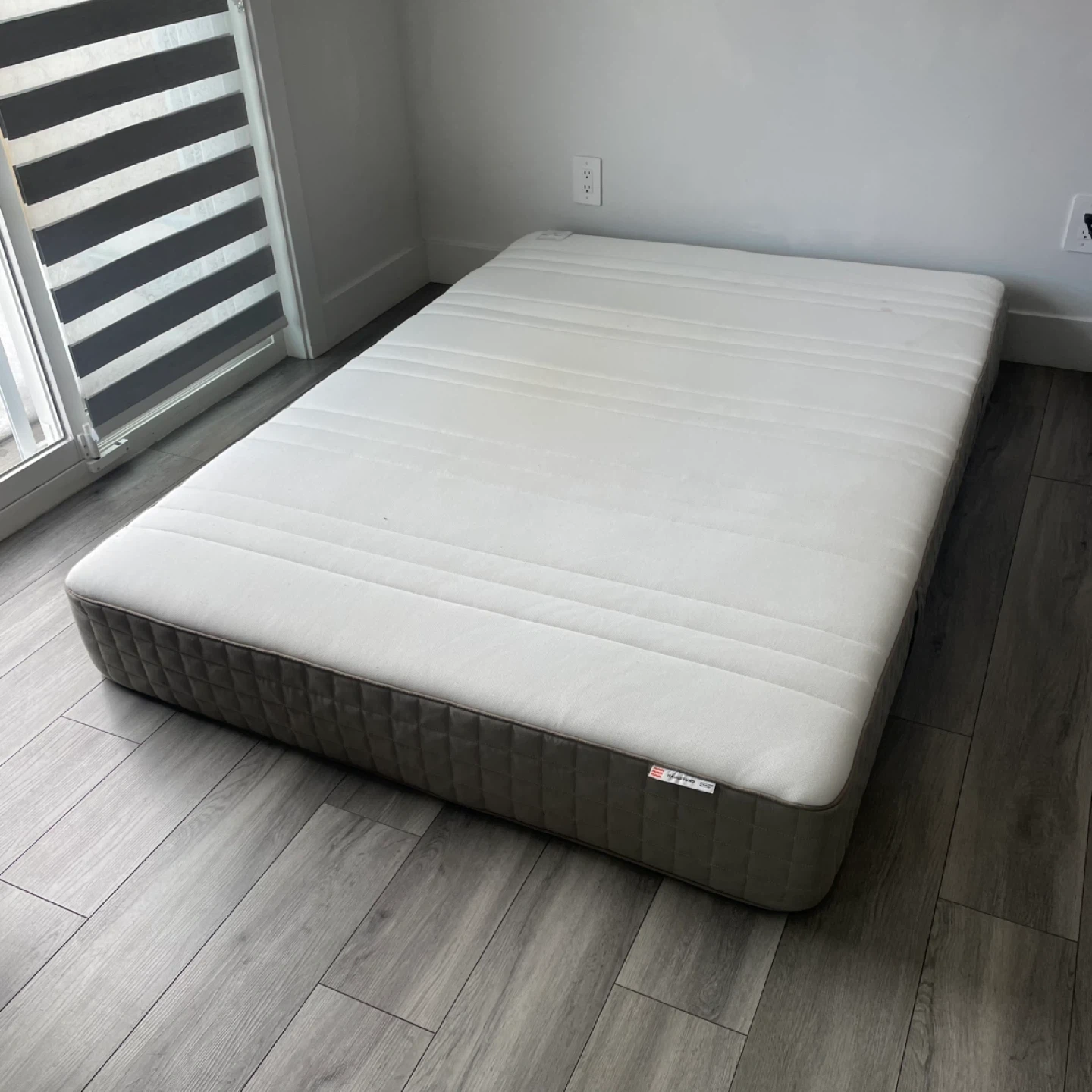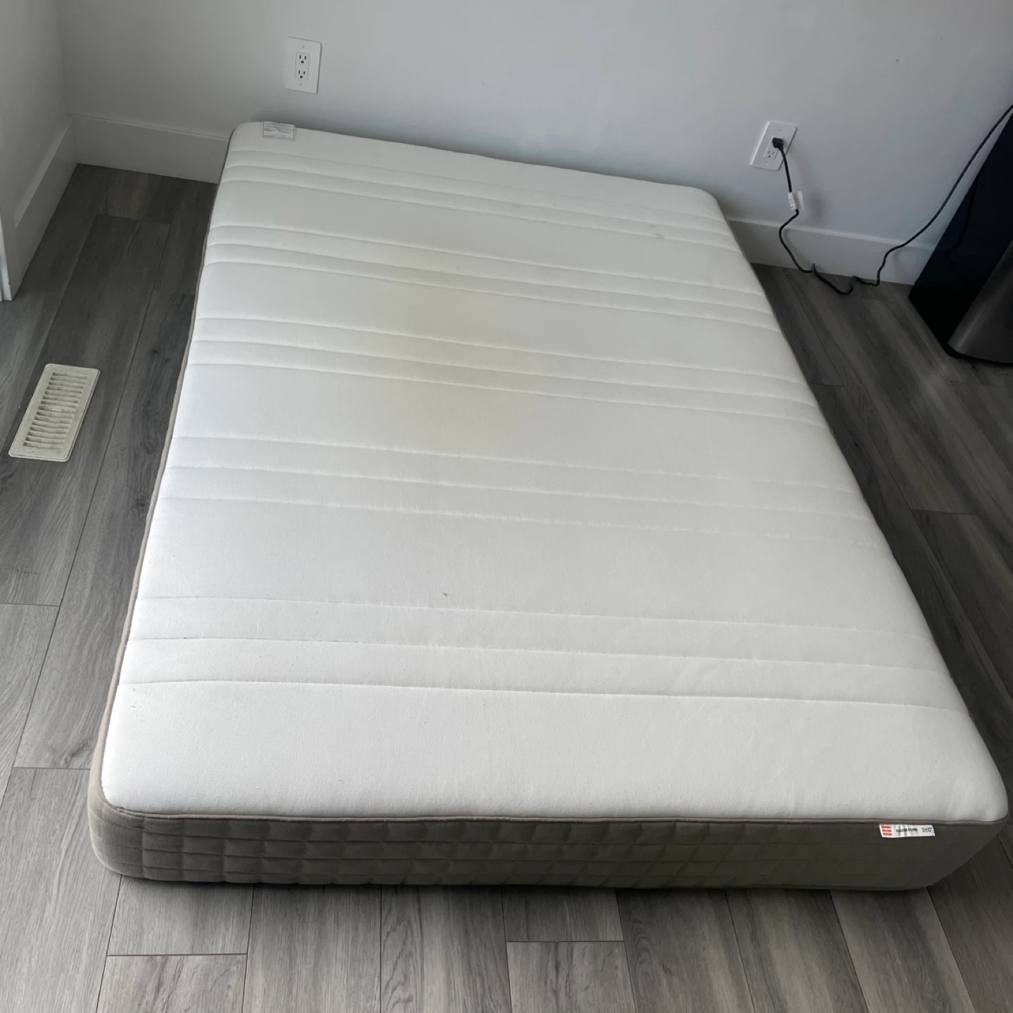 IKEA HAUGEBUND Mattress. It's In Good Condition But Has Wear As Shown, Has A Grey and white Color Scheme.