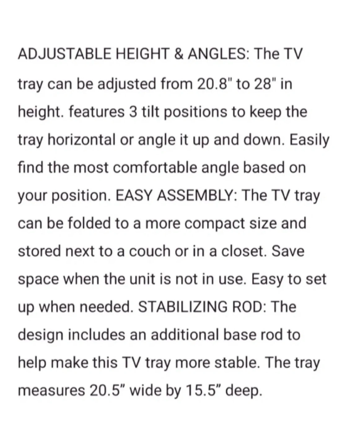 The tray measures 20.5” wide and 15.5” deep (inches), and can be adjusted from 20.8” to 28” (inches) in height.