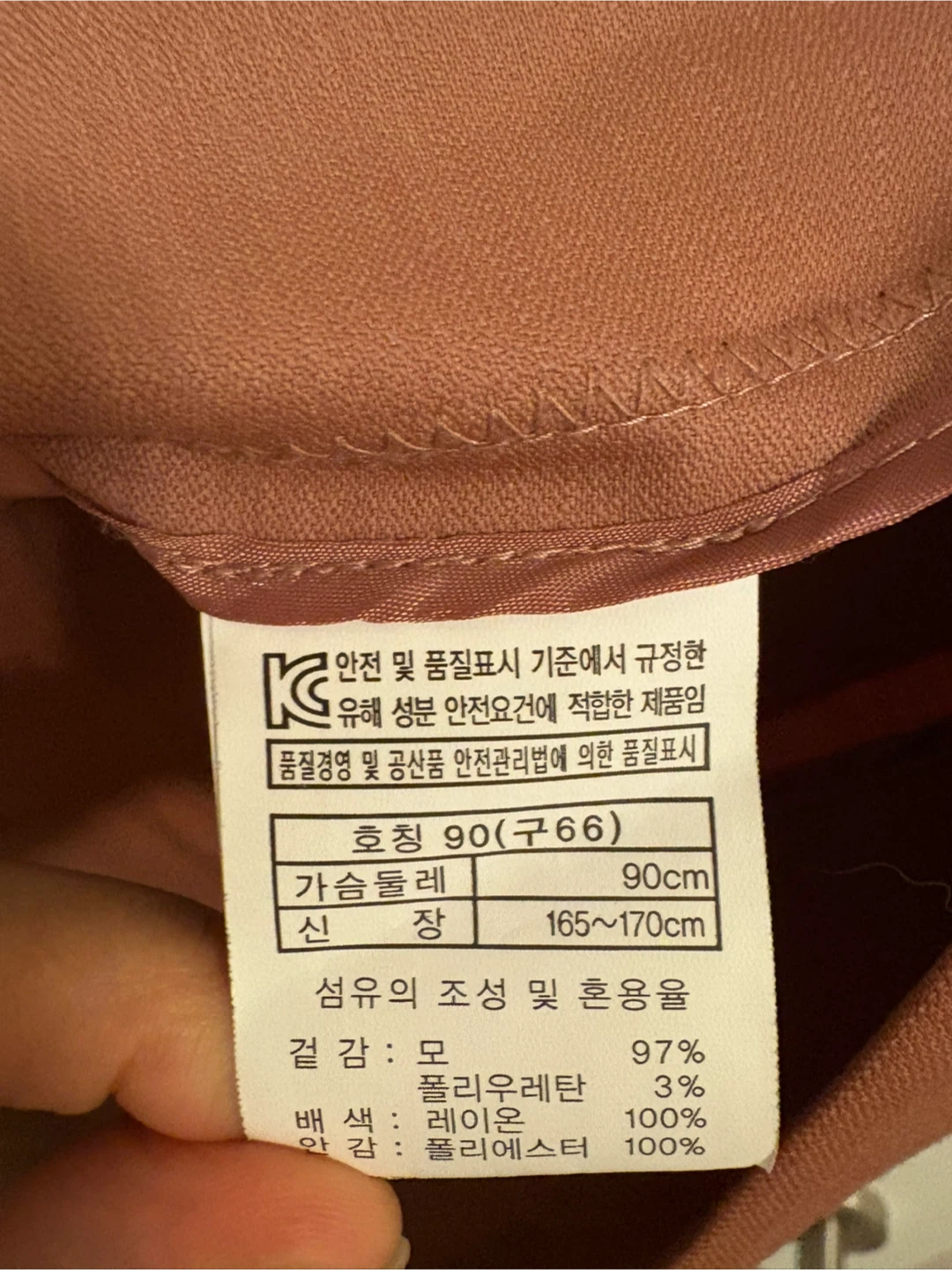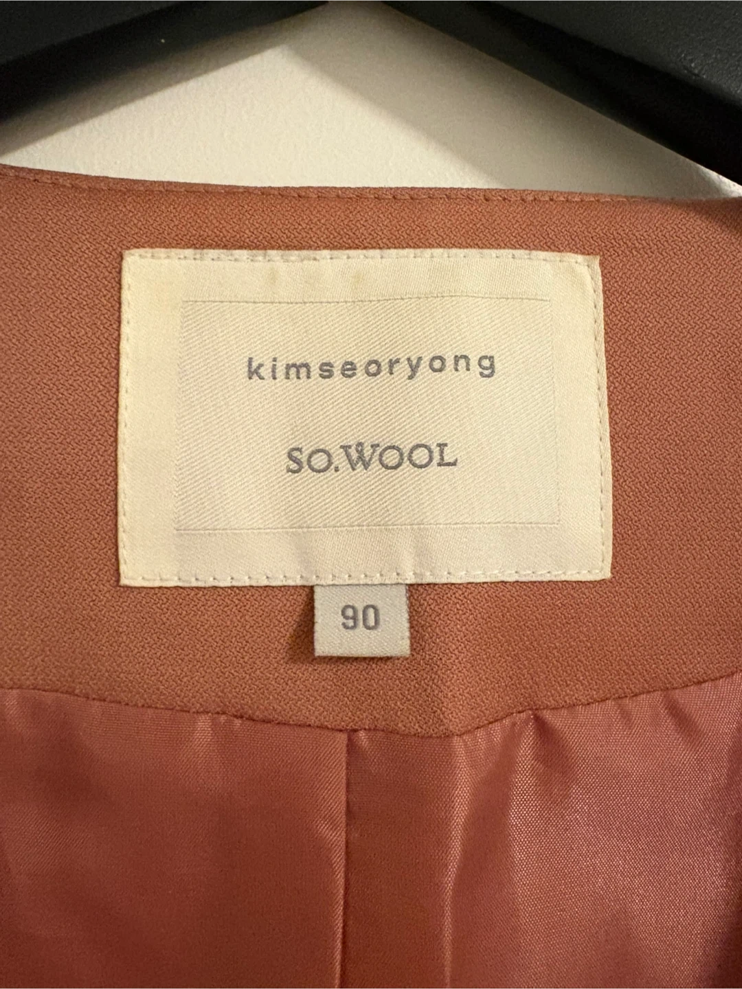 Selling a Kimseoryong So.Wool blazer in size 90. The outer material is 97% wool and 3% polyurethane, with a 100% polyester lining. It fits someone with a height of 165-170cm and a chest size of 90cm