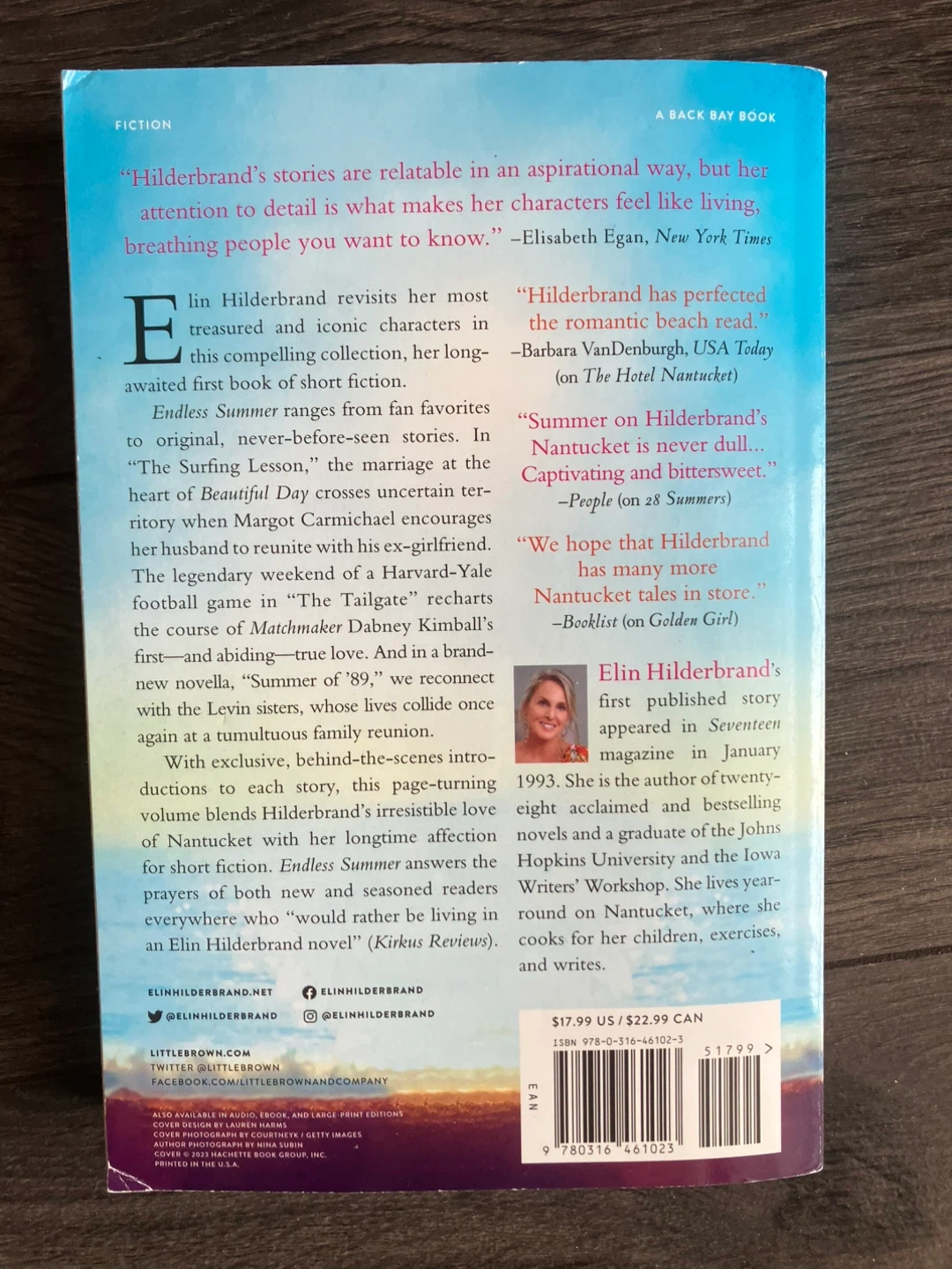 Elin Hilderbrand's latest collection of short stories, Endless Summer, revisits her most cherished characters. This book offers a look at life, love, and family. Stories from Days That Last Forever.