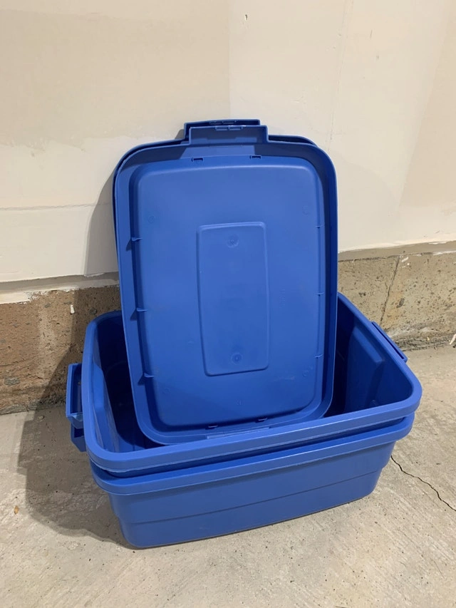 I have two 38L (10 gal) Rubbermaid Roughneck Storage totes with lids. Dimensions: 24”x16”x9”. Excellent condition. Various other sizes and colors also available, so please inquire.