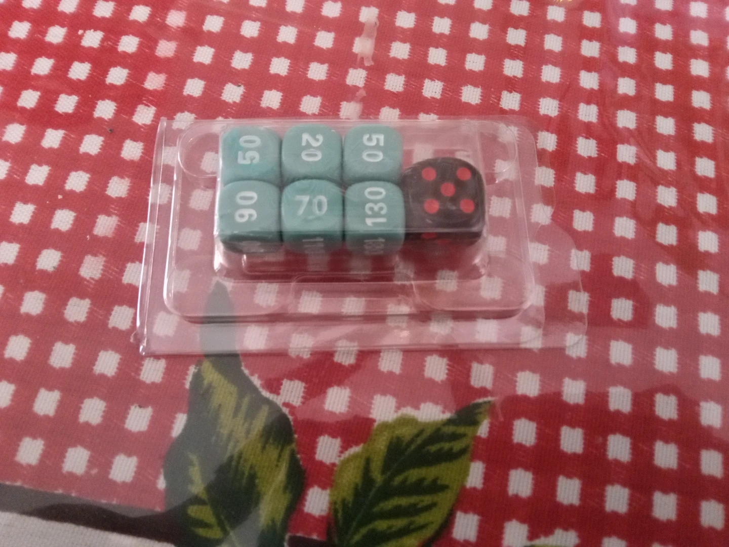 This set includes 8 dice. Six dice are light blue with numbers 06, 20, 50, 70, 90, and 130. Two dice are black with red dots. They're in a clear plastic case.
