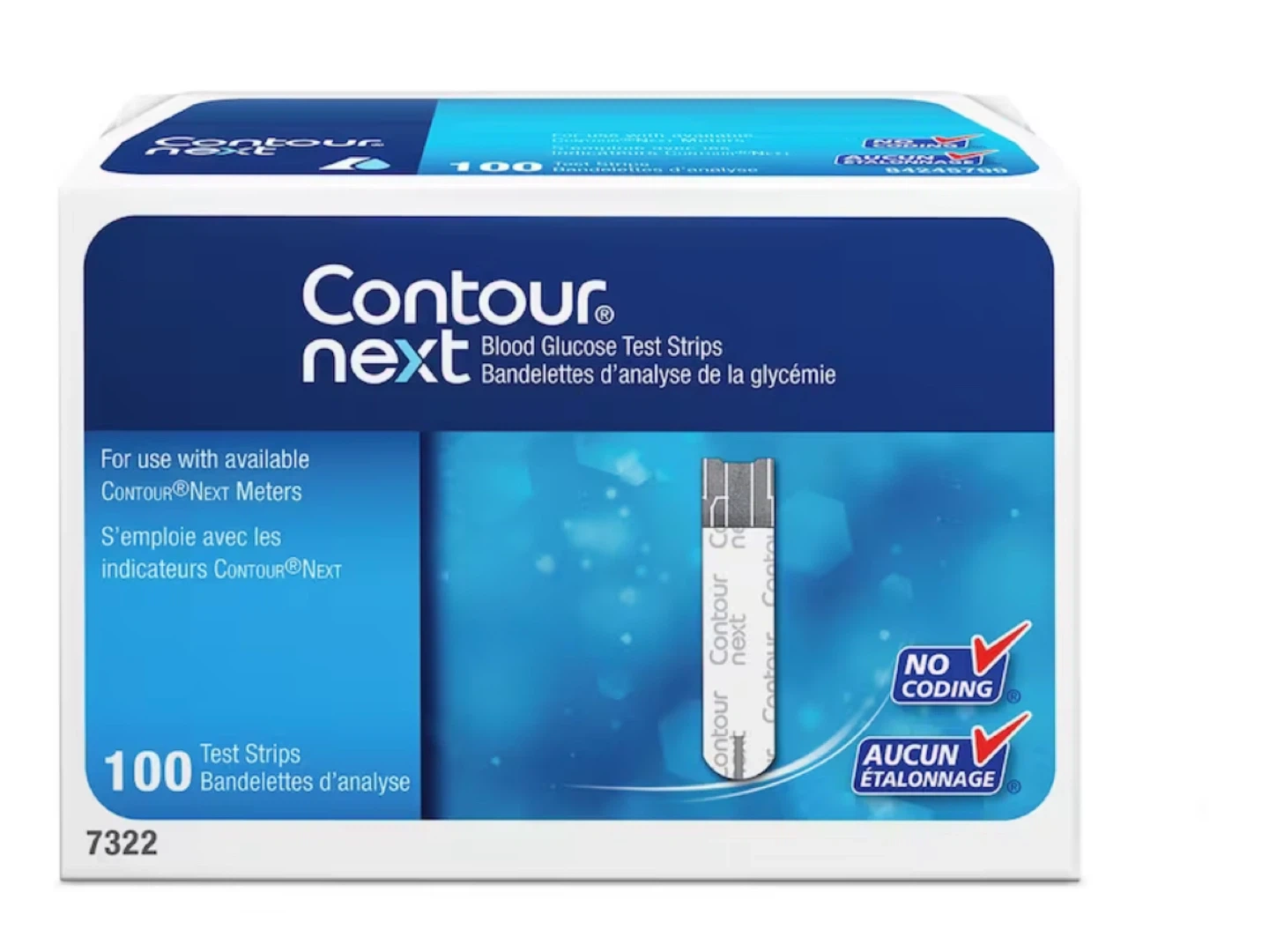 Contour Next blood glucose test strips for use with Contour Next meters. It's no coding and comes with 100 test strips per box. Expiration date is November 2026.
