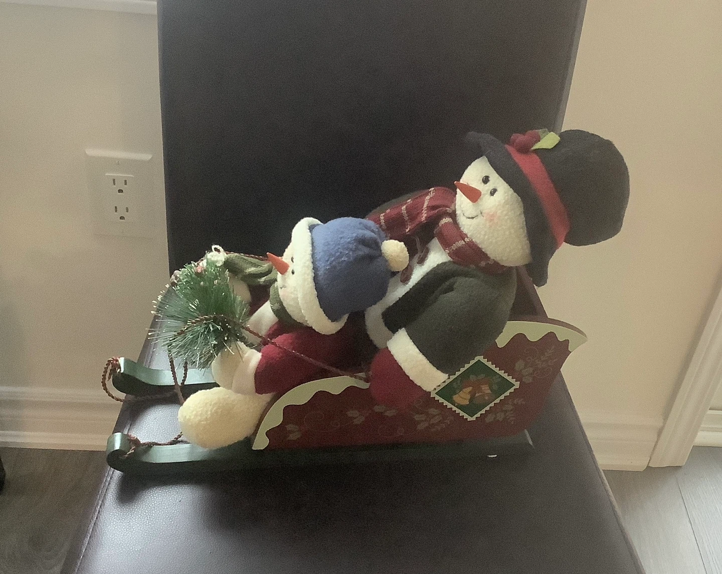 A cute snowman plush on a decorative sleigh! It's in great condition and would be a lovely addition to your holiday decor