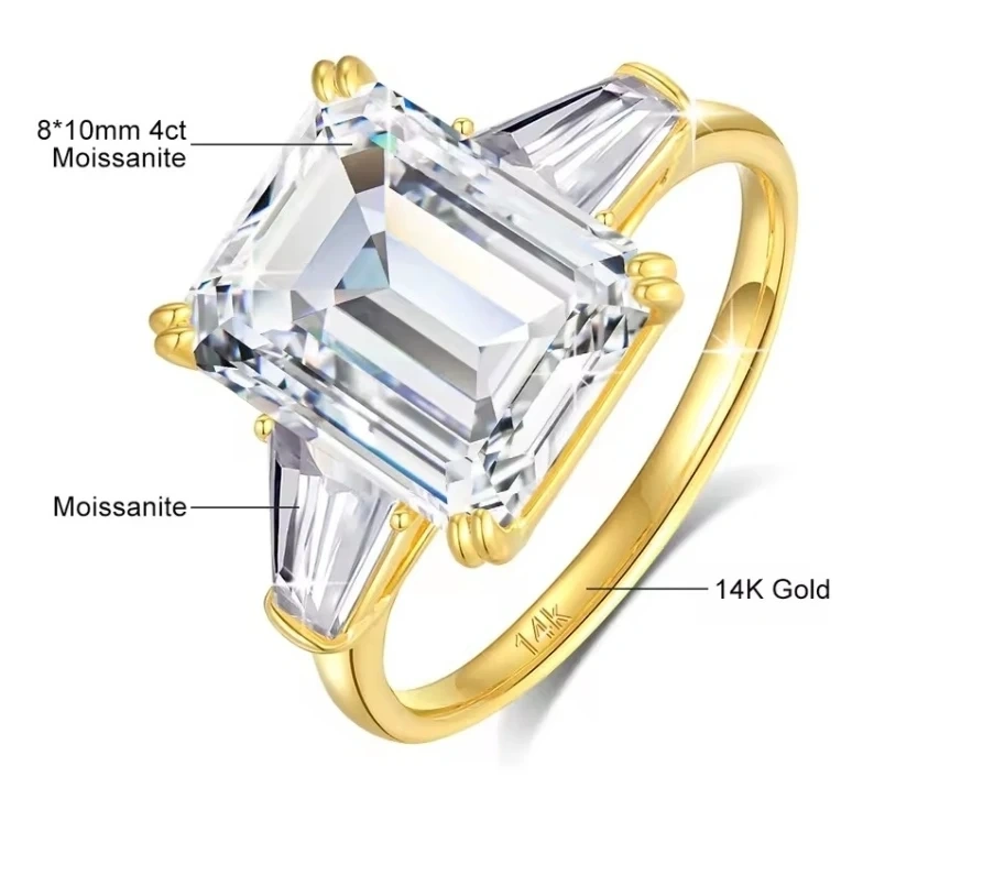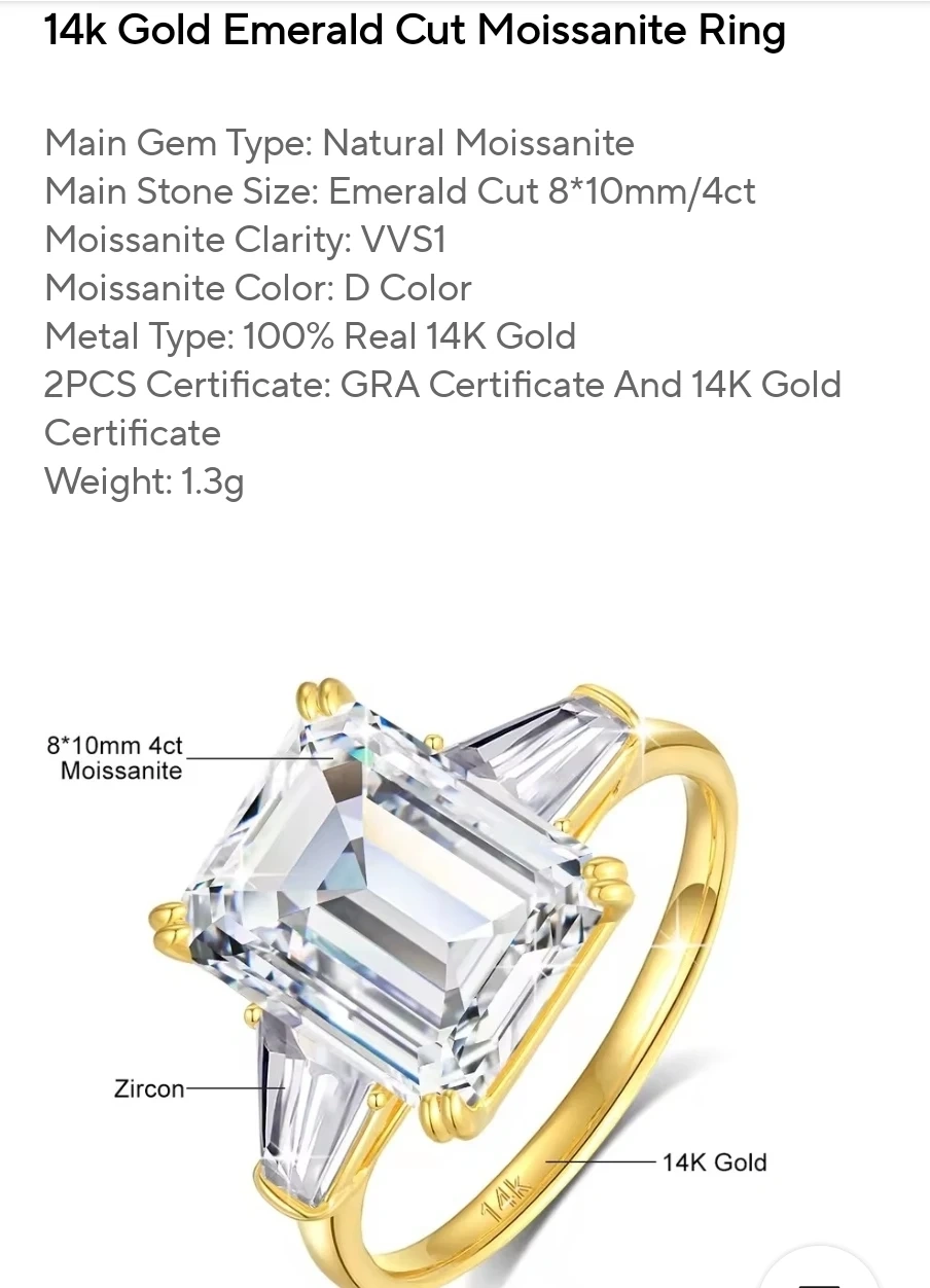 25Selling a beautiful Genuine 14k gold ring with an emerald cut Stone that shines like sun in dark. The main stone size is 8*10mm/4ct, and the LB Diamond moiss clarity is VVS1 with a D colour. It's a stunning piece! with the same material diamond on the sides not compromising the quality and maximum color glow like a glare from the skys turning darkness into light and represents itself as if sun is shining on your finger. get yourself a gift π of European Schick style Ring or gor your loved ones. This item with it's property is about $1500.00+ taxes. don't pay for others expenses and overhead costs by marking up the price, $599.00 taxe included. any concern ? email us at ; Shaneasa1@gmail.com thank you