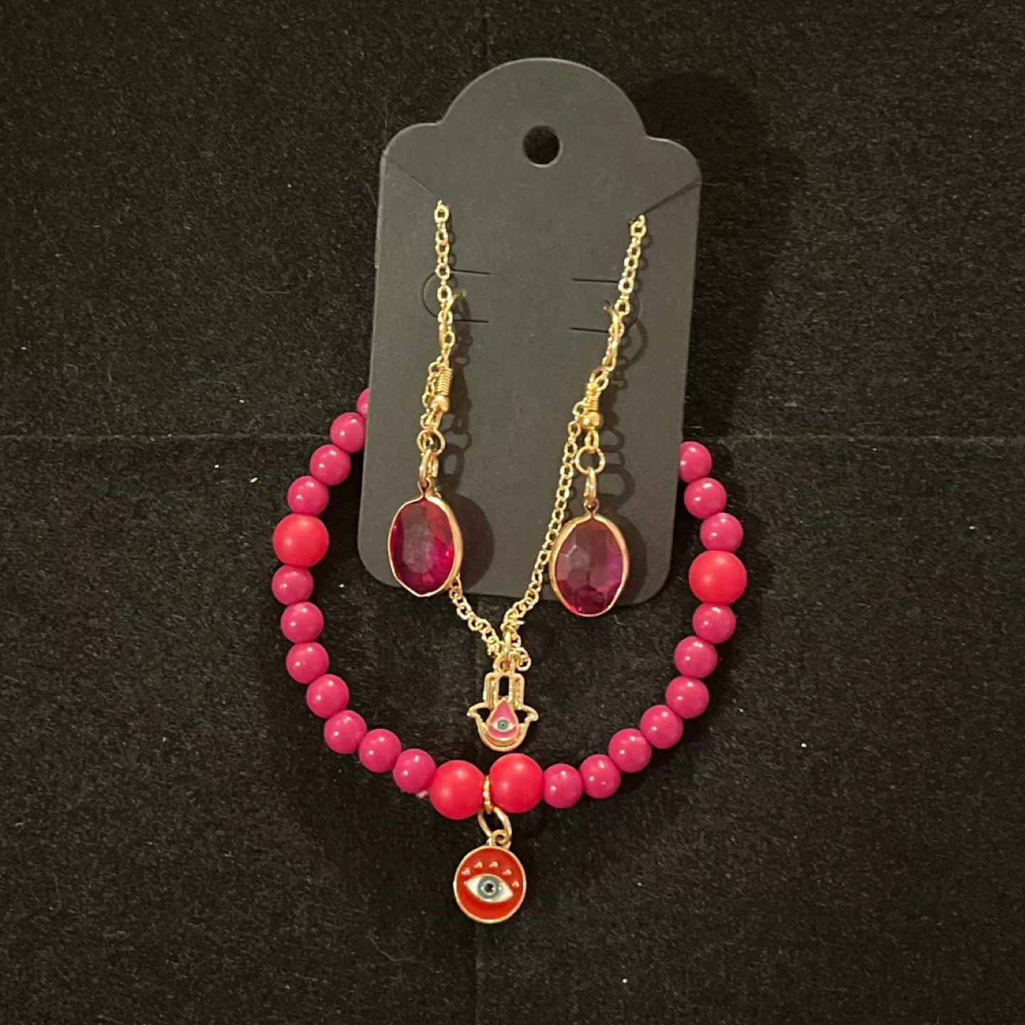 827Selling a cute 14k gold evil eye jewelry set! It comes with a pink beaded bracelet, a necklace and matching earrings. The bracelet and necklace features a pink evil eye charm and the earrings are a matching gold and pink to complement each piece. Carefully handcrafted with love and perfect for adding a pop of colour to your outfit! 🩷 The pink evil eye is associated with love, friendship, and emotional healing, bringing a sense of calmness, contentment, and relaxation to the wearer. It is believed to protect and nurture relationships, strengthen friendships, and promote self-love and openness 🩷 Pendant sits just below the collarbone Let me know if interested in purchasing from me thx 🙏💕 Pick up only ☺️ (available between 11am-6pm) Located at Queen and Sherbourne intersection 🙌 Check out my listings for more deals! 🤩 🔥 Bundle items for a discounted price (excluding items $5 and under)🔥