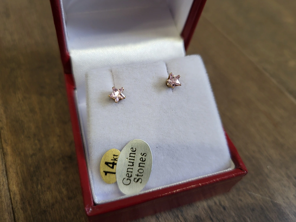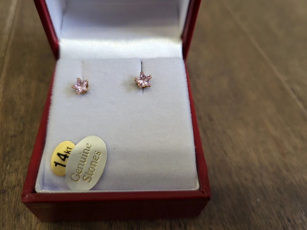 230Pair of 14k gold star-shaped stud earrings. Features pink genuine stones. Comes in a red jewellery box. cubic zirconia stones, yellow gold. great gift or present, birthday, birthstone, anniversary, Christmas, engagement, Valentine.