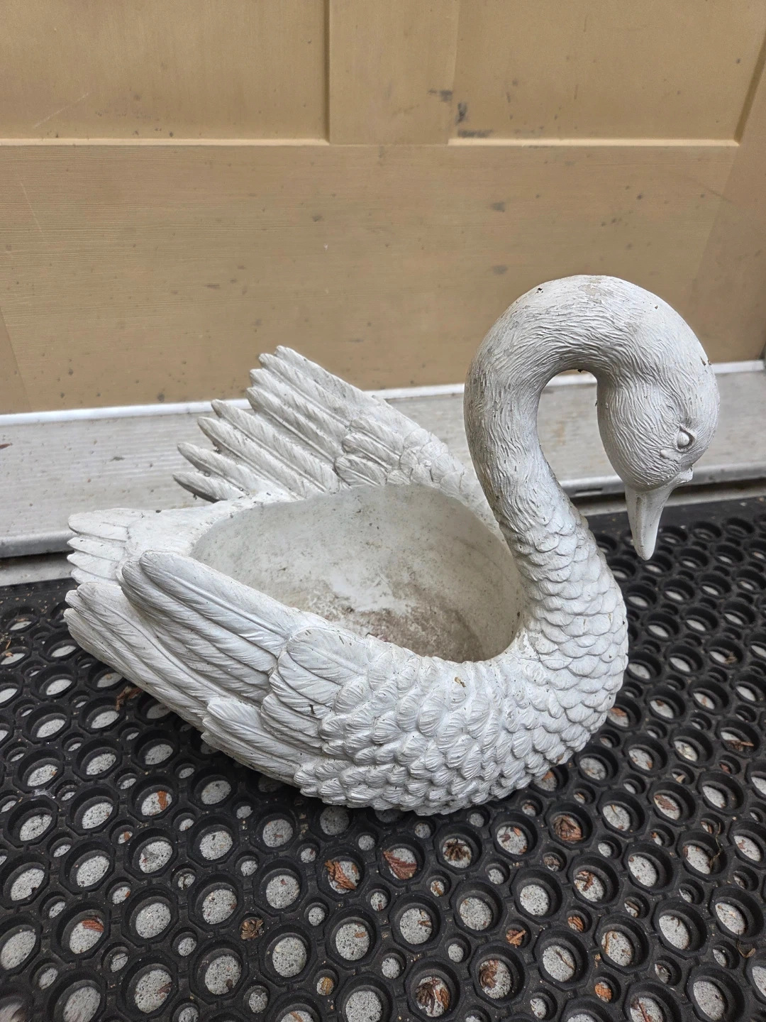 A charming white swan planter from Anthropologie. It's made of durable material and perfect for your favourite plants! Adds a whimsical touch to any outdoor or indoor space.