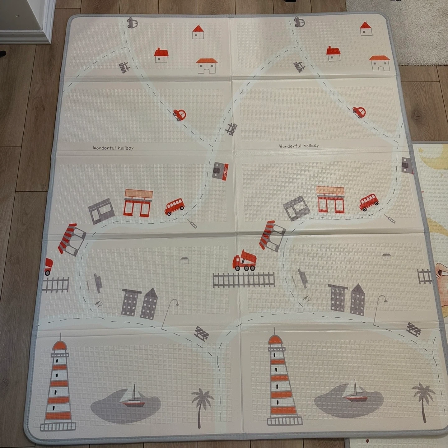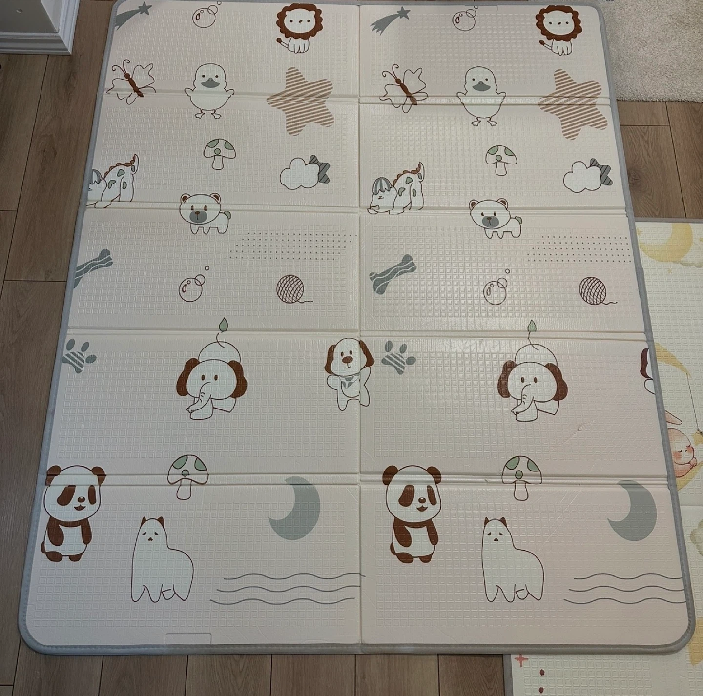 Here's a foldable baby playmat from JOYPONY, suitable for ages 0 months and up! It features cute animal designs on one side and a town scene on the other. Easy to fold up and store in its carrying bag for convenience