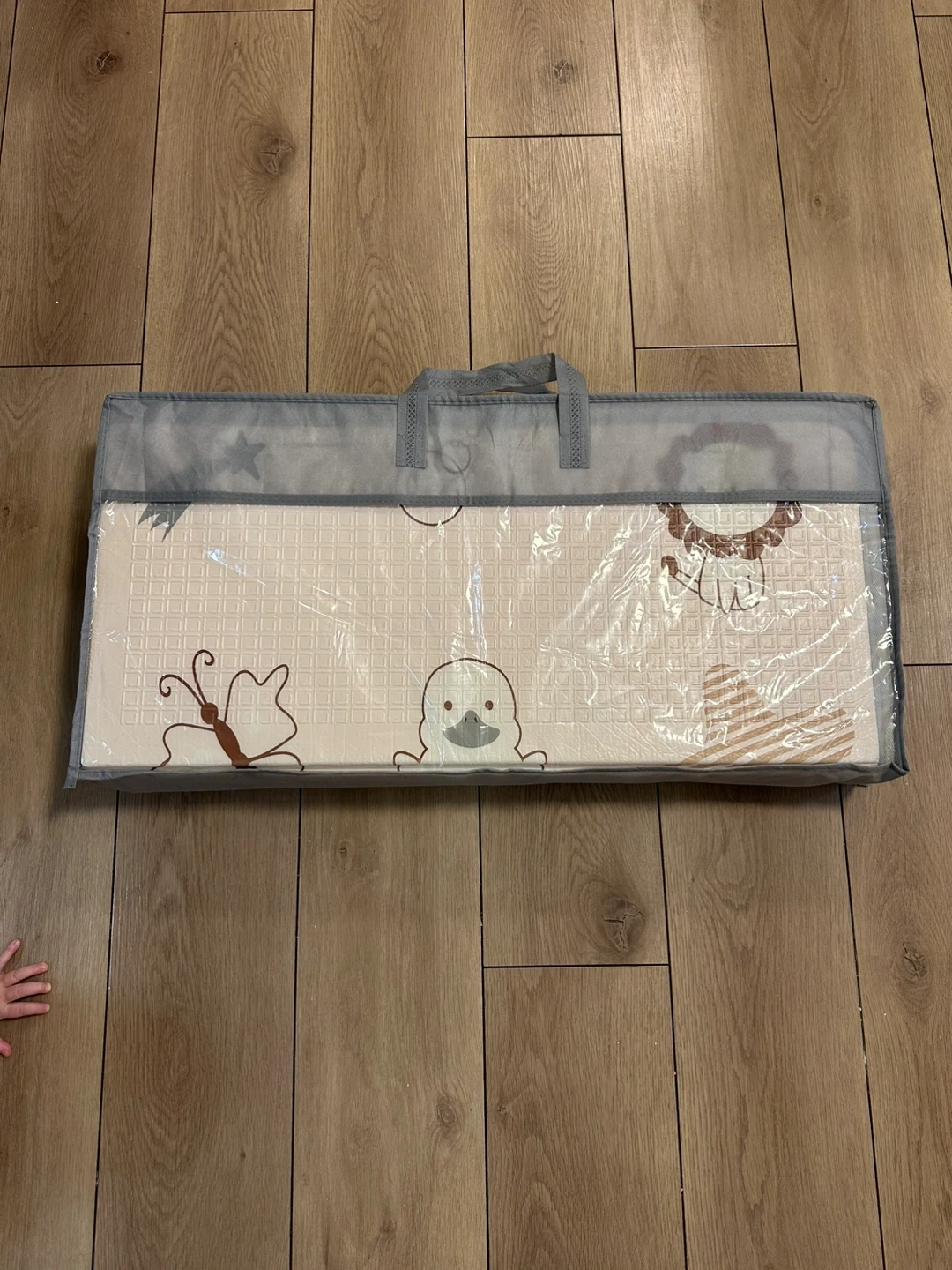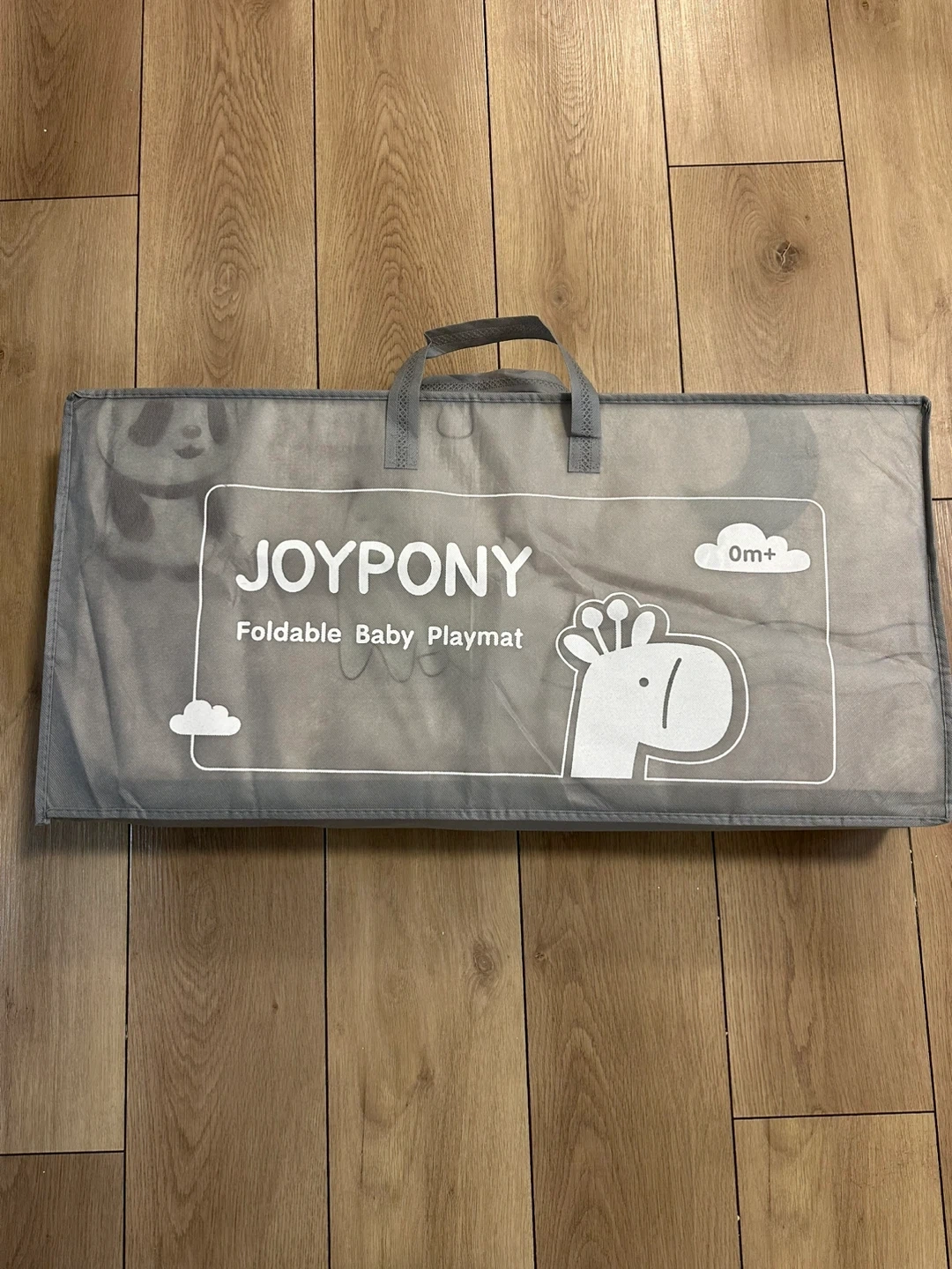 Here's a foldable baby playmat from JOYPONY, suitable for ages 0 months and up! It features cute animal designs on one side and a town scene on the other. Easy to fold up and store in its carrying bag for convenience