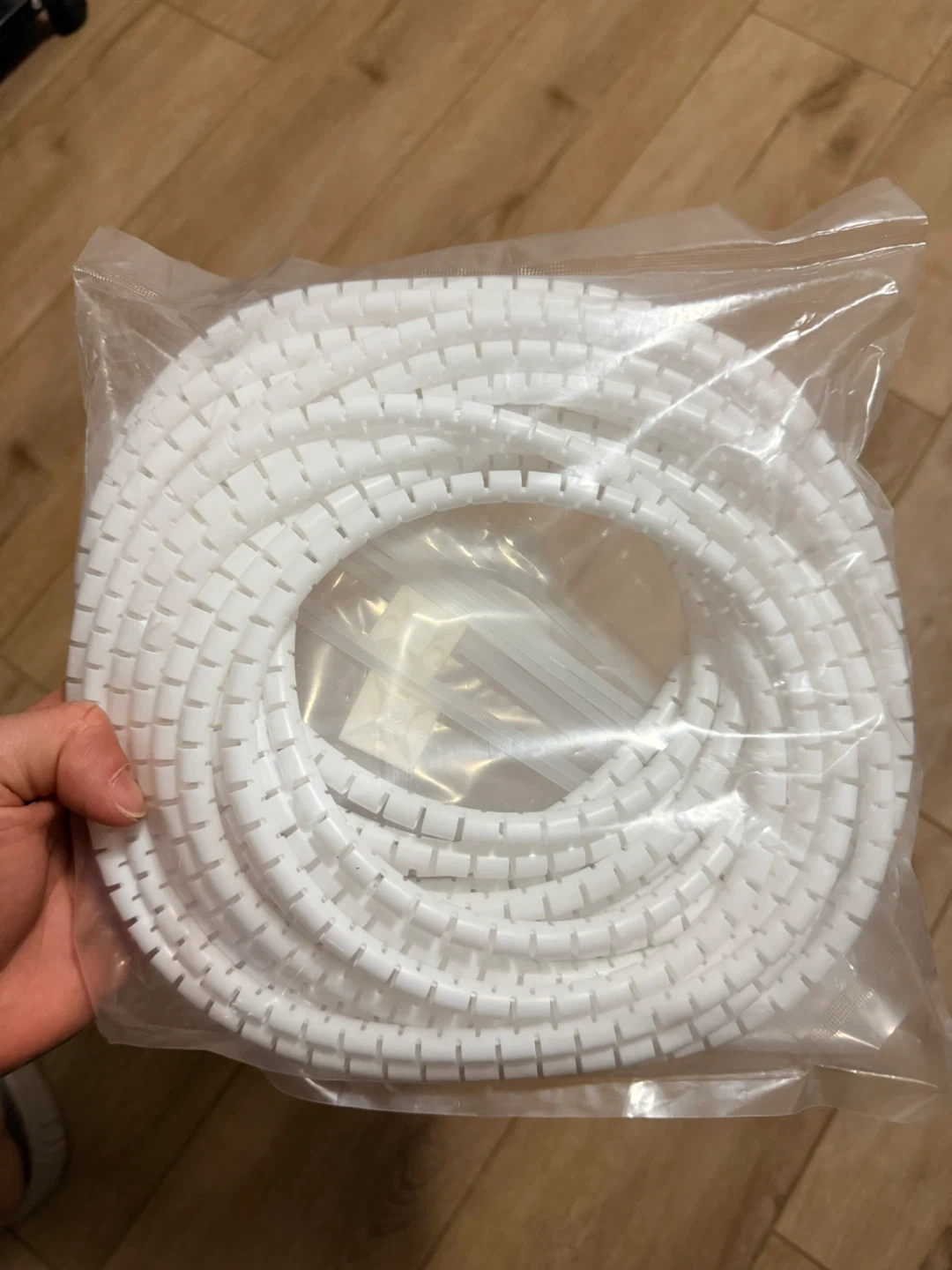 Manage your cords with this white spiral wrap. It's great for organizing cables behind your desk or entertainment centre. Plastic material. 10meters long 8mm thick and brand new unopen