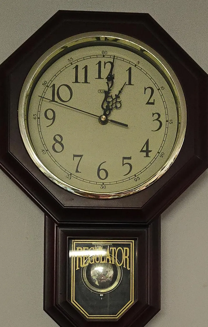 Wall clock with a classic design! The clock features an octagonal frame with a pendulum at the bottom. It would be a great addition to any room!
