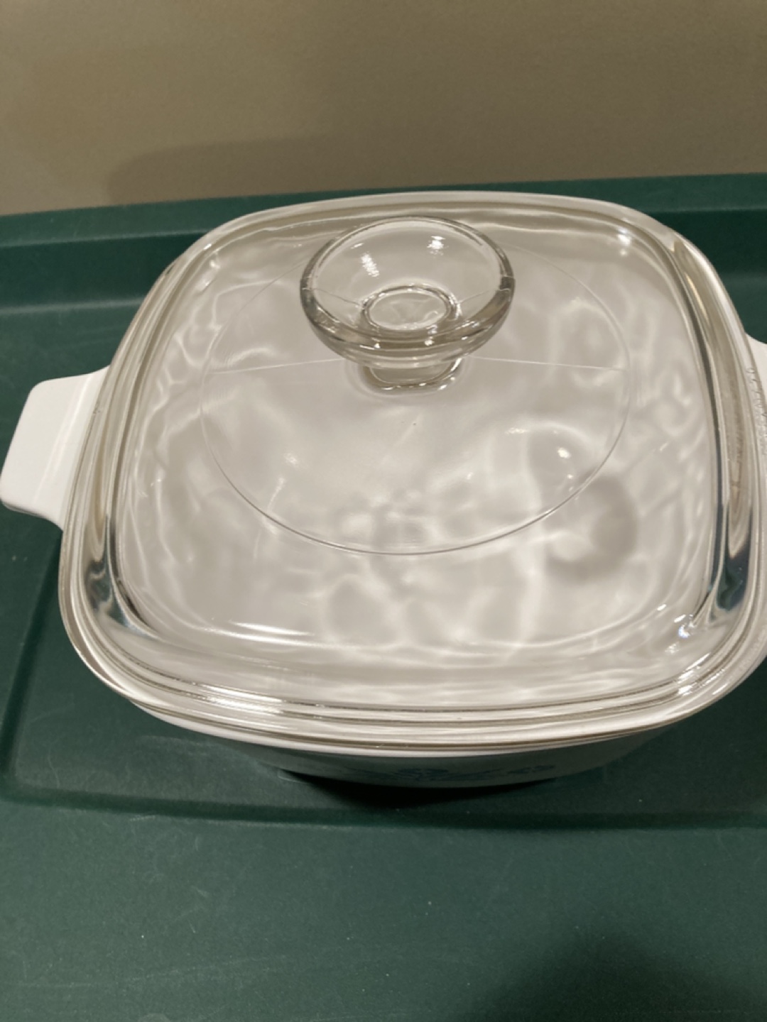 Blue flower pattern. Glass lid. Made in Canada. For range and microwave use. Square shape. White base.