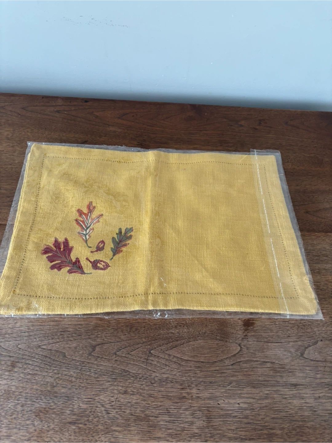 Two yellow cotton placemats featuring embroidered autumn leaves. 100% cotton material. Never used, in new condition and comes with original packaging. 20” by 14”. Cash only.