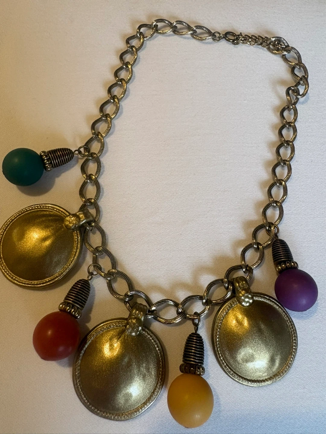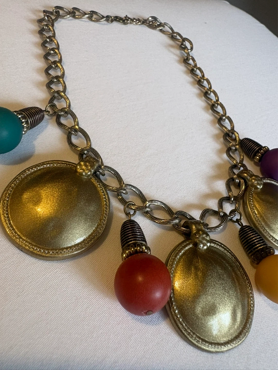 Features round gold-tone discs and brightly coloured beads in red, yellow, purple, and teal.
