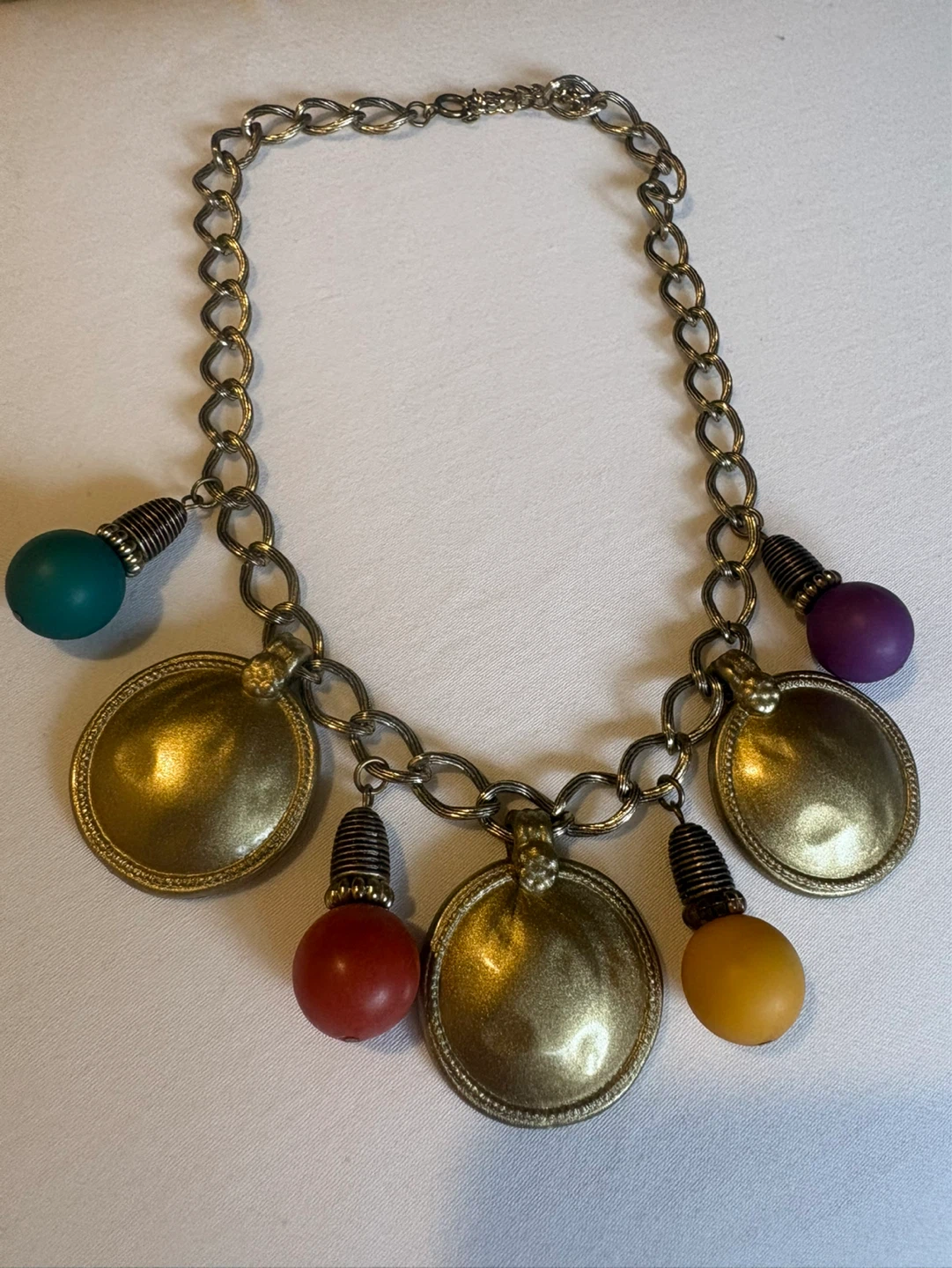 Features round gold-tone discs and brightly coloured beads in red, yellow, purple, and teal.