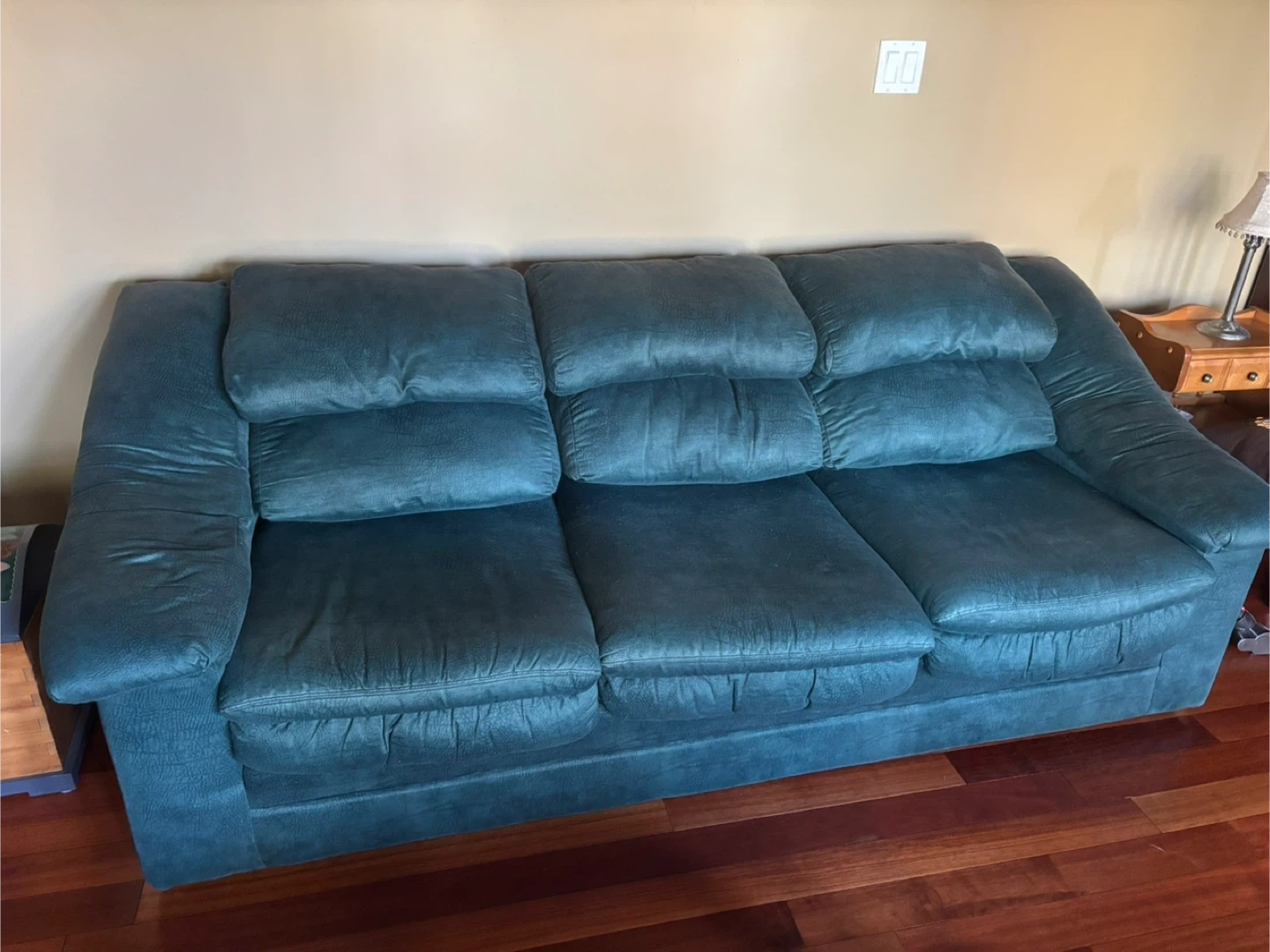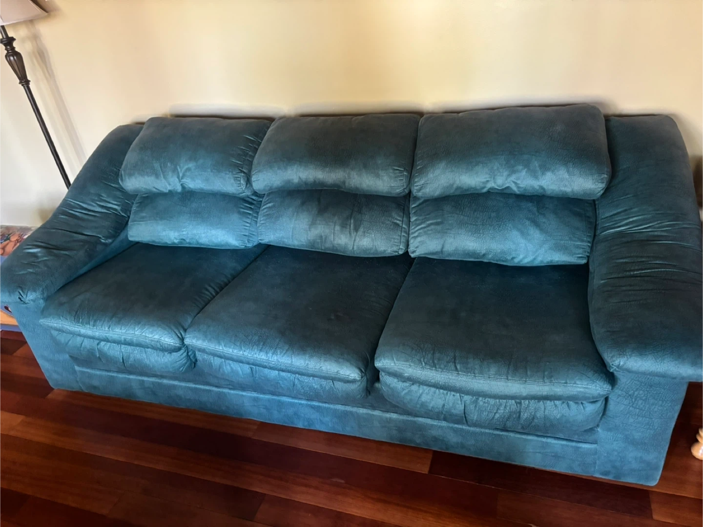 Comfortable green loveseat and three seater couch in good condition. Perfect for a living room or apartment. The colour is a nice, muted, phthalo green that would go well with many decor styles