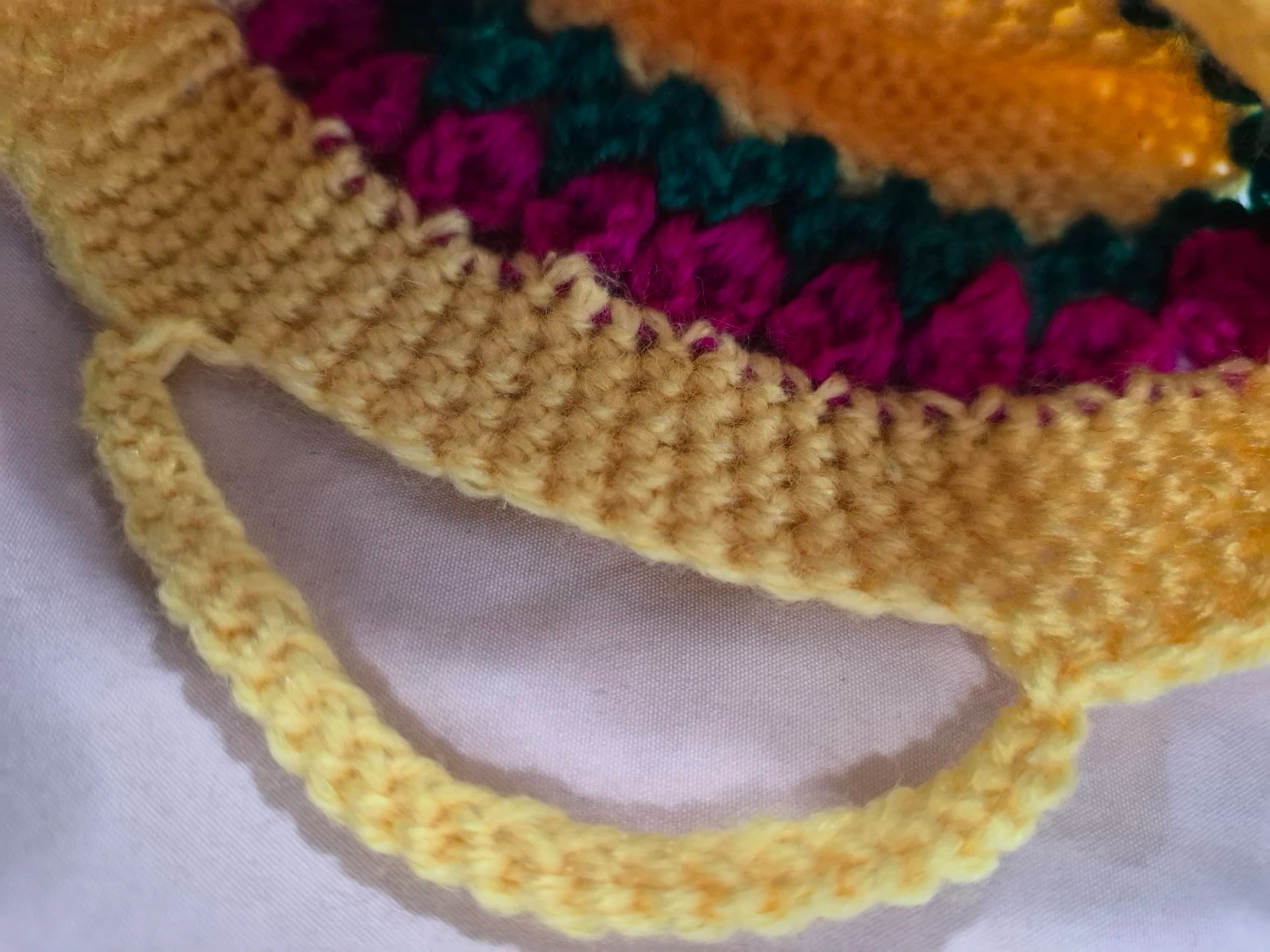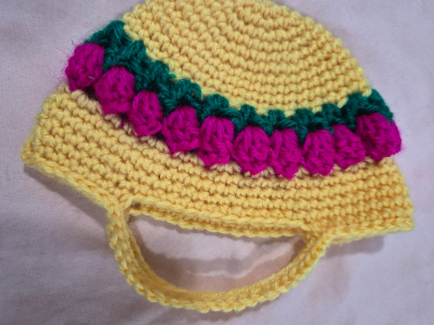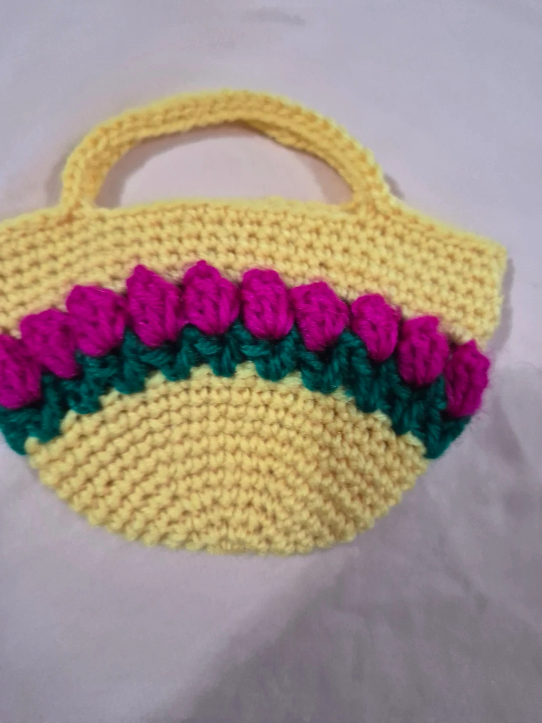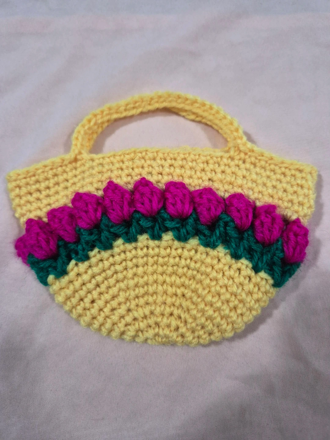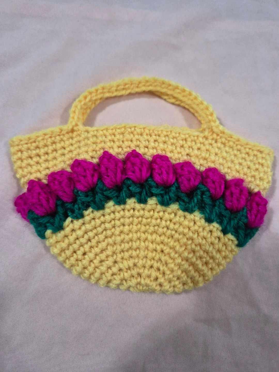 This is a cute, handmade crochet purse in a bright yellow colour. It features a decorative band of pink and green crocheted flowers along the front. It's perfect for small items or as a decorative piece. Yarn material.