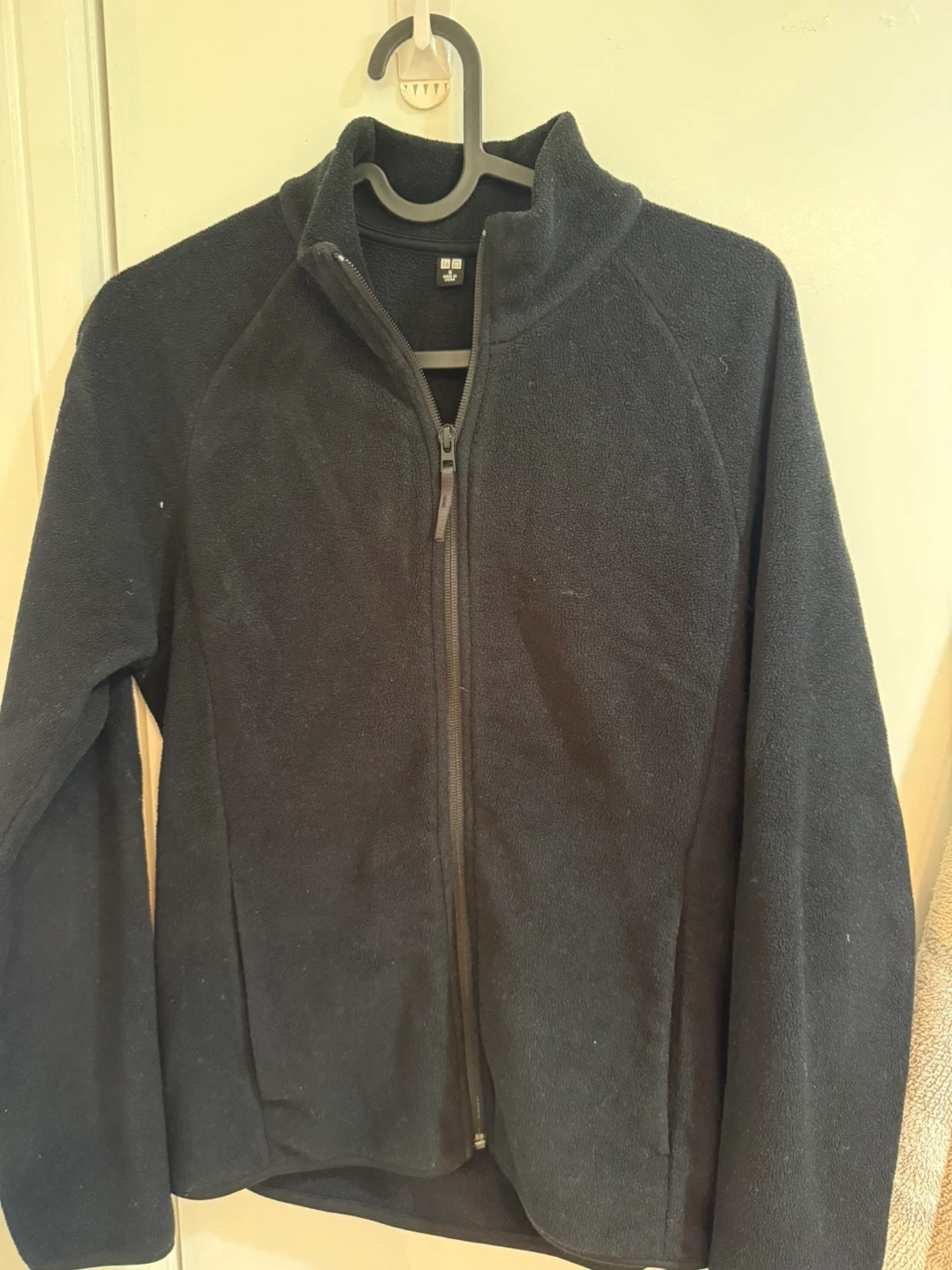 This is a black fleece jacket from UNIQLO. It's a size medium but purchased from Korea so actual size is S. The material is soft and warm.