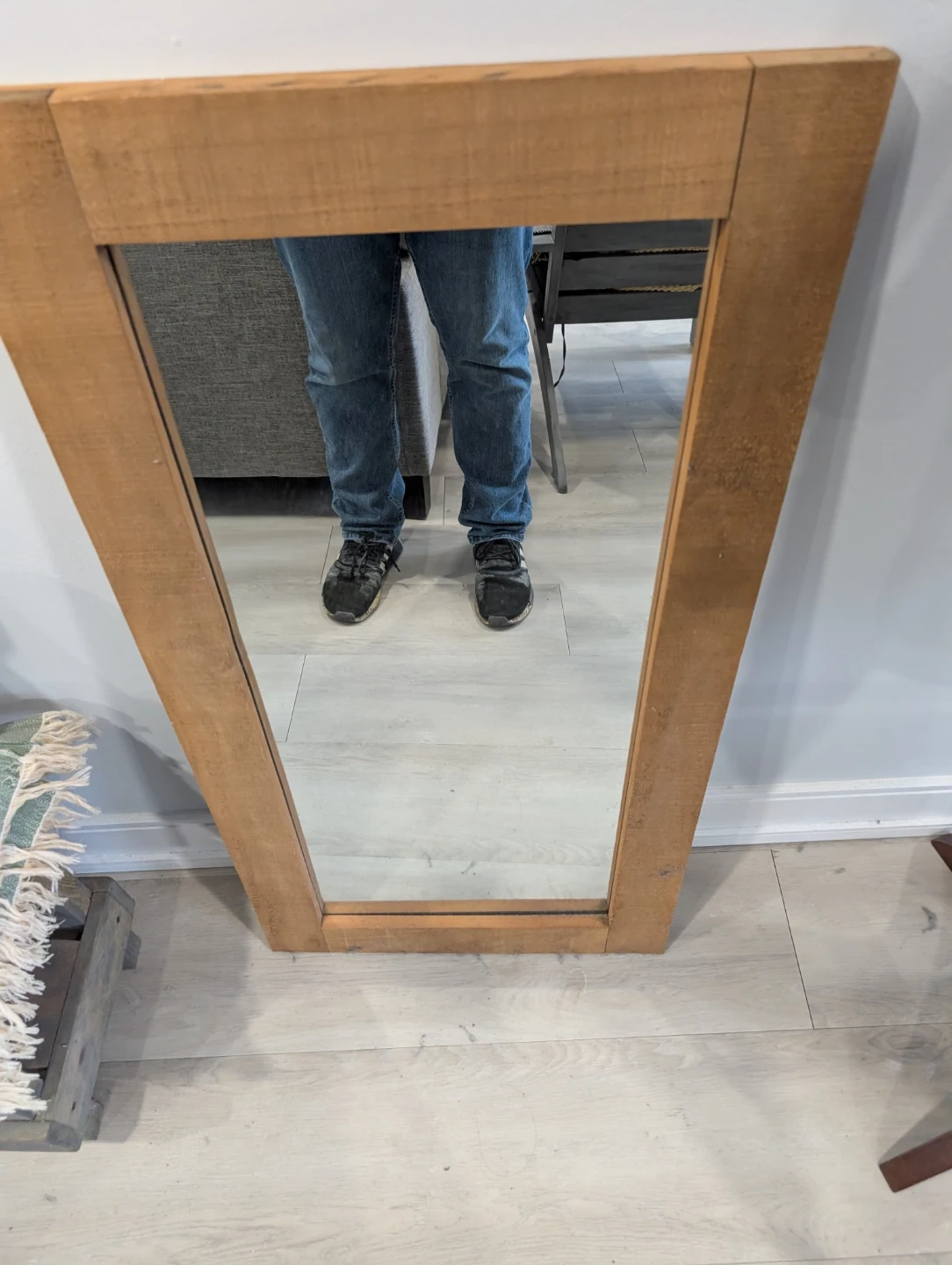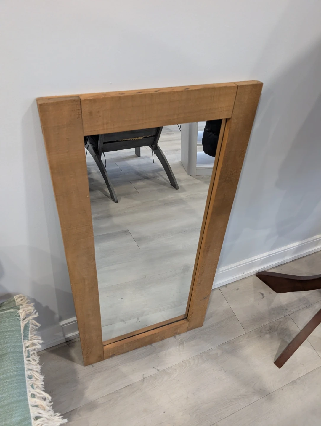 A decorative mirror with a rustic wood frame. It's perfect for adding a touch of warmth to any room. The frame is made of natural wood, giving it a unique, handcrafted look.