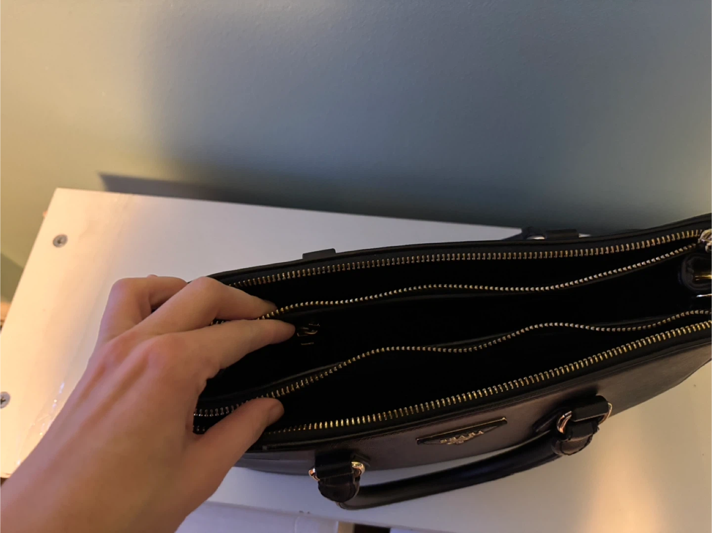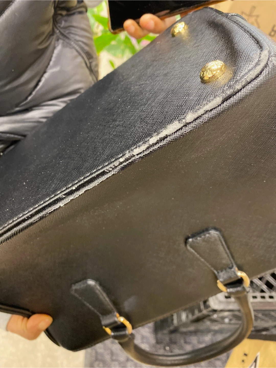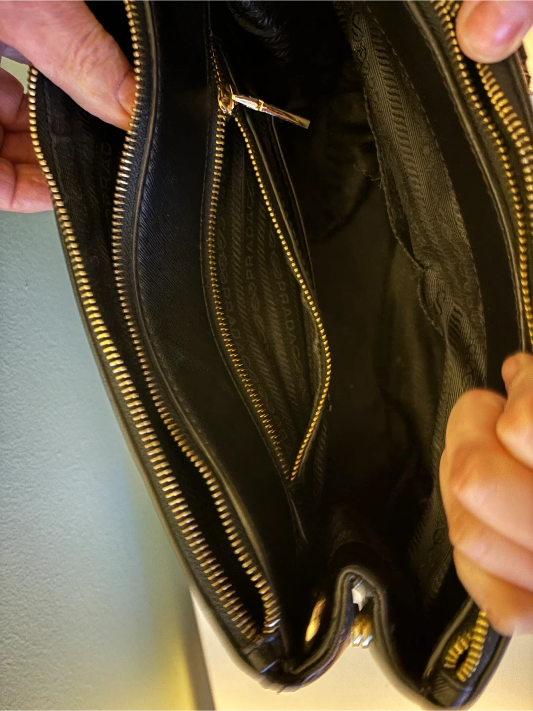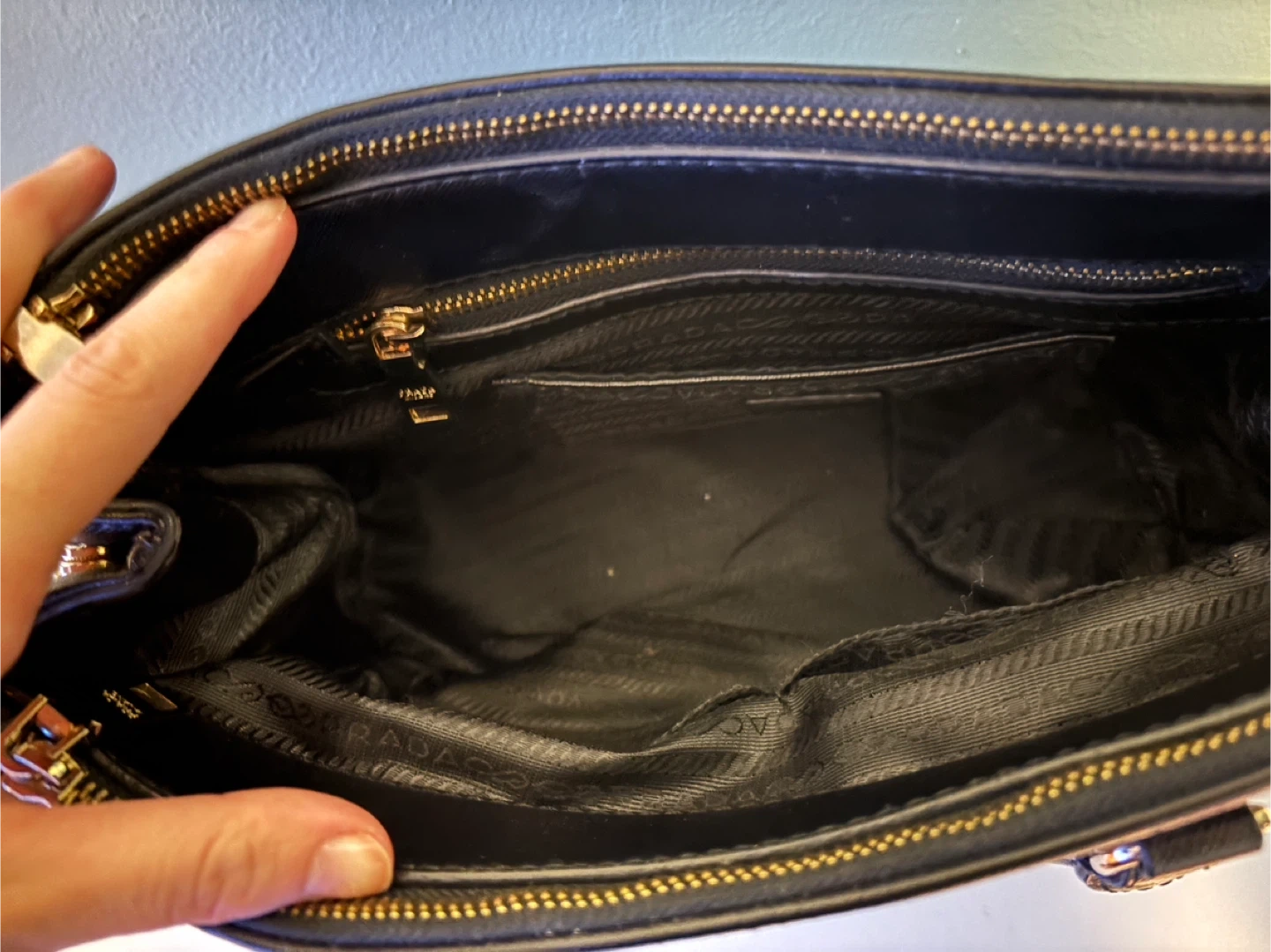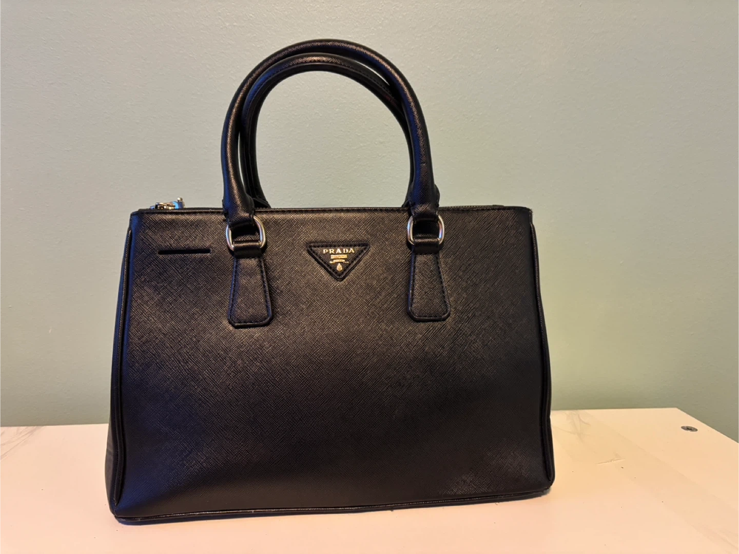 This is a classic PRADA inspired black leather tote handbag. It features a zippered main compartment and interior pockets. Note the scratch at the bottom