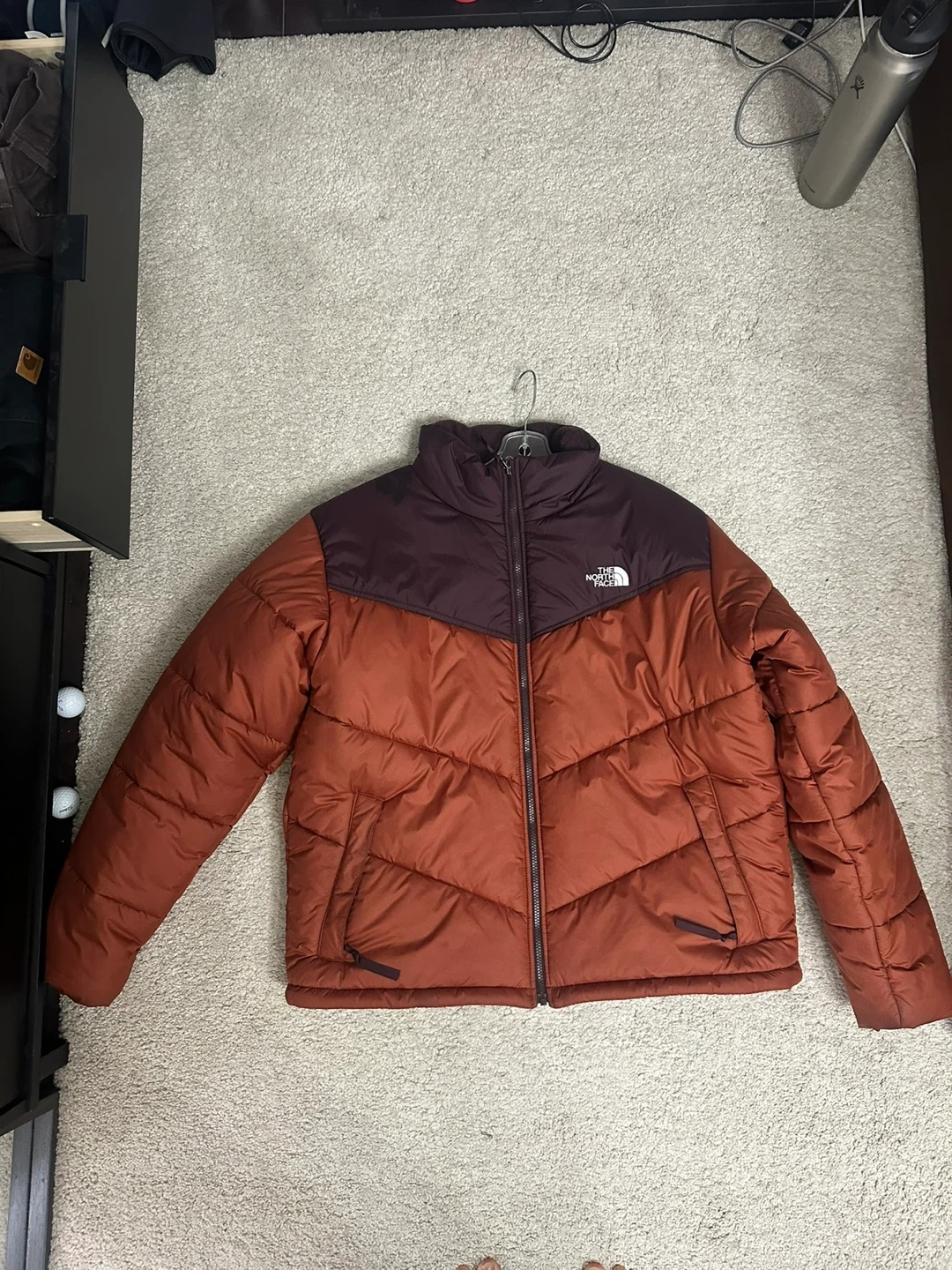 The North Face puffer jacket in a rust colour with a dark maroon yoke and collar. It's a stylish and warm outerwear piece. Insulated for cold weather protection.