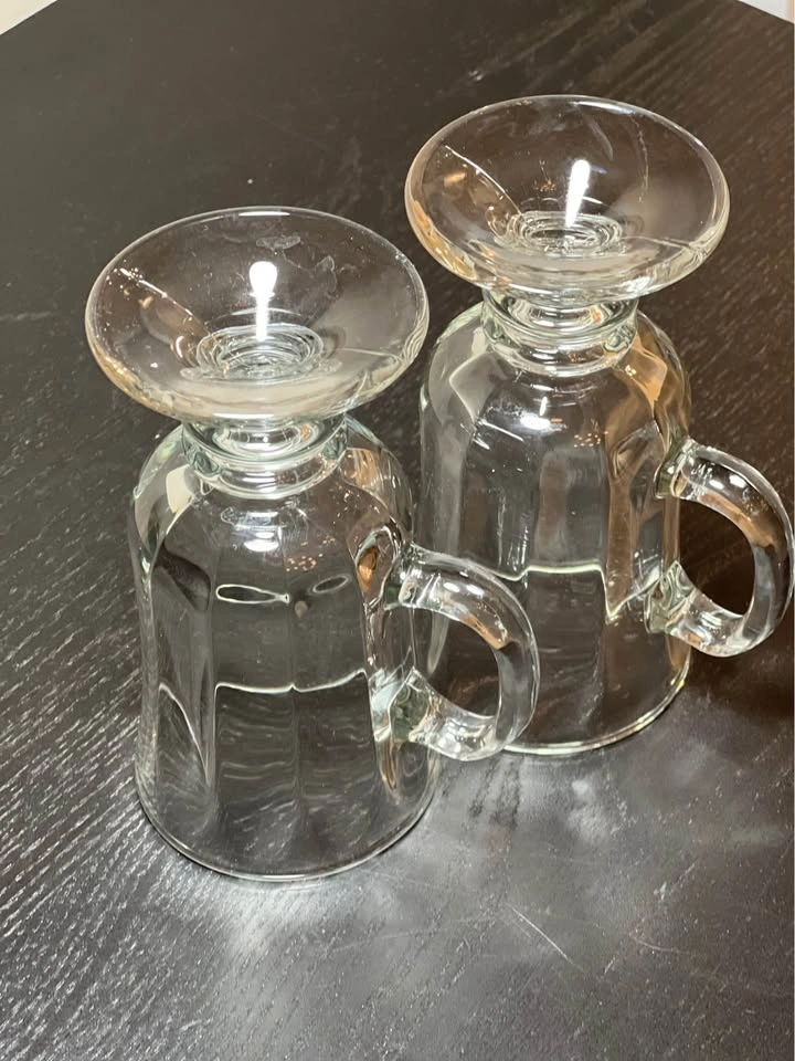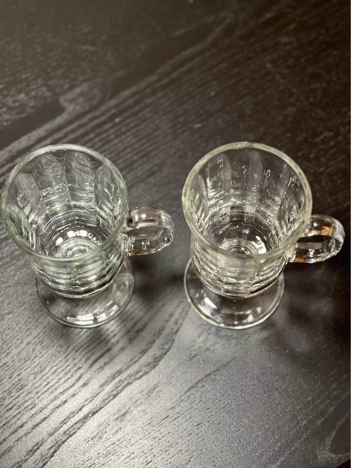 Two Libbey Milan Irish Coffee Mugs. These clear glass mugs feature a paneled design and a pedestal base. They hold 8 to 8.5 ounces and are dishwasher safe. Perfect for Irish coffee, cappuccinos, or other hot beverages. Pre-owned. Pickup is at 58th and 7th Ave in Midtown Manhattan.