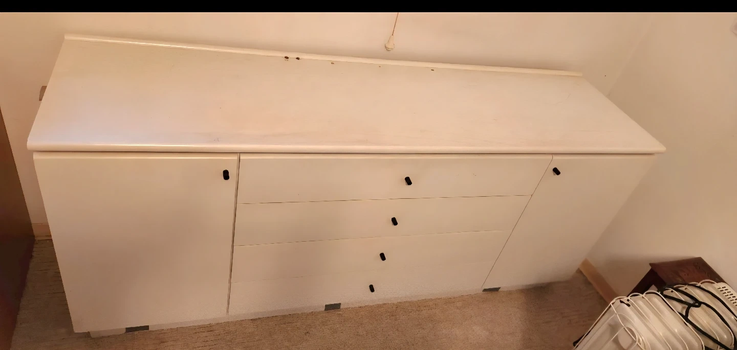 This white sideboard offers ample storage with three drawers and two cabinet sections. It's made of wood and has a clean, modern design. Perfect for organizing your living room or dining area!