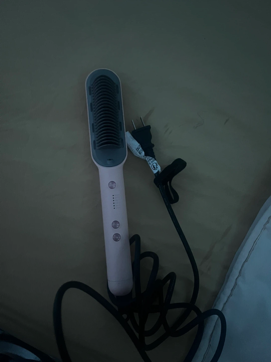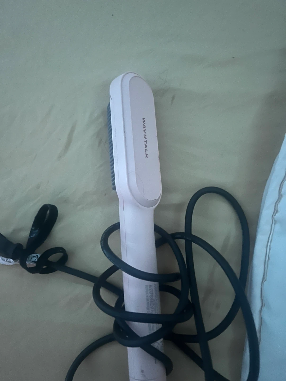 This is a pink hair straightening brush from WAVYTALK. It features multiple heat settings indicated by LED lights and power buttons. The brush has a durable cord and plug for use.