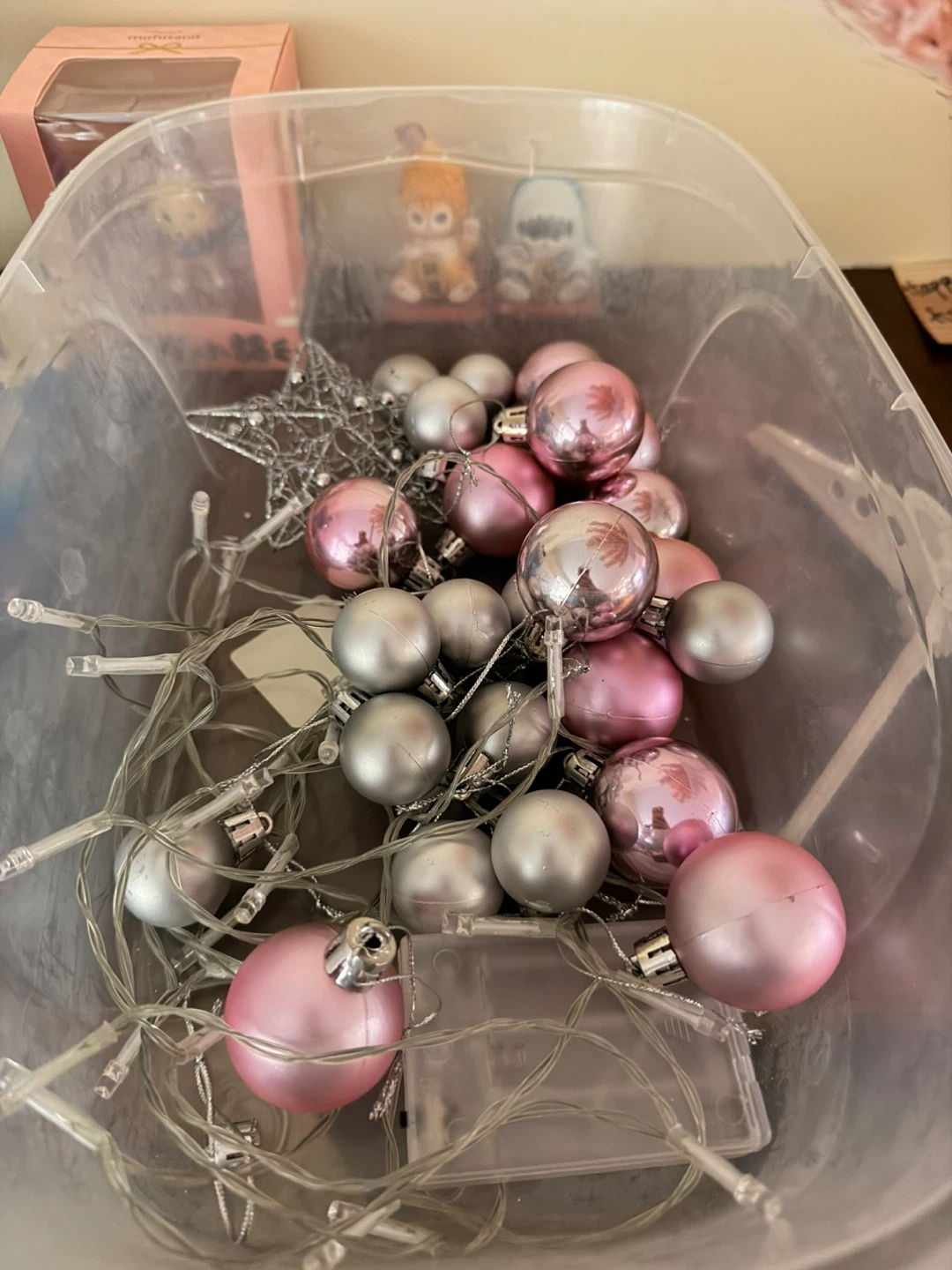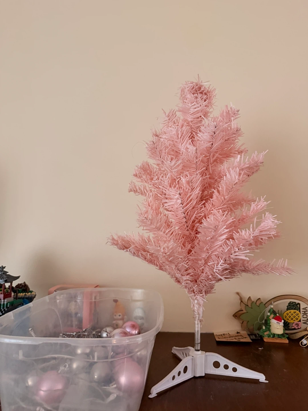 A cute pink Christmas tree, perfect for adding a touch of whimsy to your holiday decor! It comes with a variety of pink and silver ornaments, as well as string lights to make it extra festive