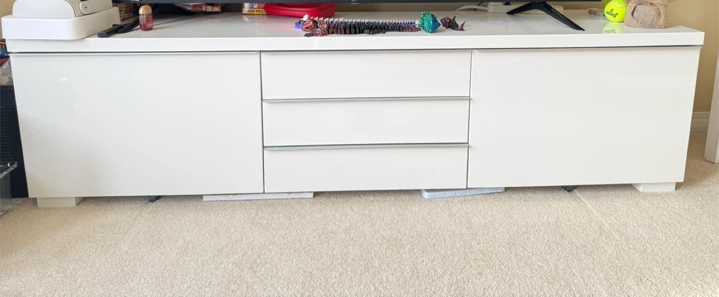 Selling a white IKEA Besta TV stand. It's in great condition and ready for a new home! The dimensions are approximately 180 cm (70 7/8") in length, 48.5 cm (19 1/8") in height, and 41 cm (16 1/8") in depth. It features a combination of drawers and cabinets for storage