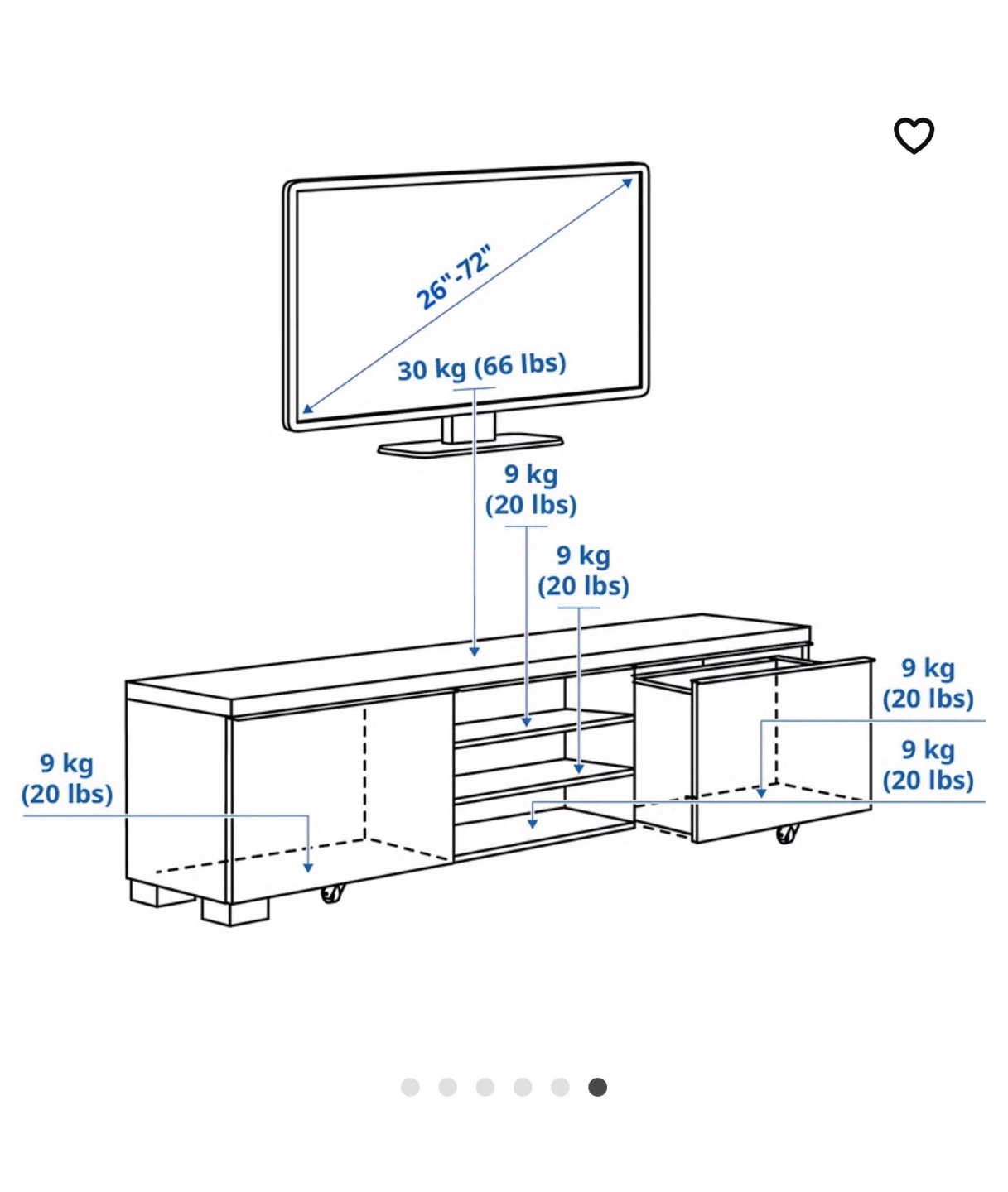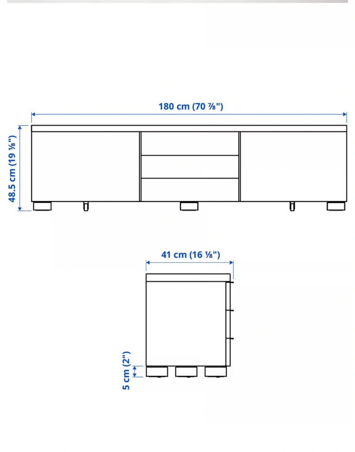 Selling a white IKEA Besta TV stand. It's in great condition and ready for a new home! The dimensions are approximately 180 cm (70 7/8") in length, 48.5 cm (19 1/8") in height, and 41 cm (16 1/8") in depth. It features a combination of drawers and cabinets for storage