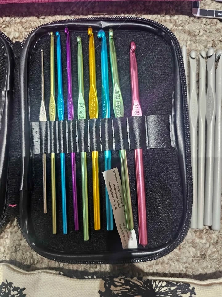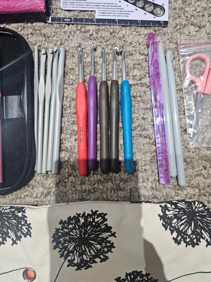 Awesome crochet hook set has everything you need to get started or add to your collection! Comes with stitch markers, mostly metal crochet hooks (except 3), little scissors, both pink zippered pouches, a fabric project bag, and a Red Heart knit check tool. Selling together. Public meetup only.