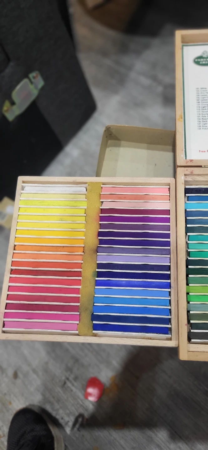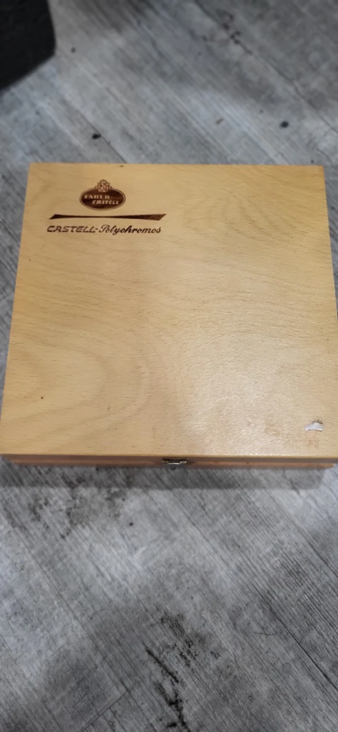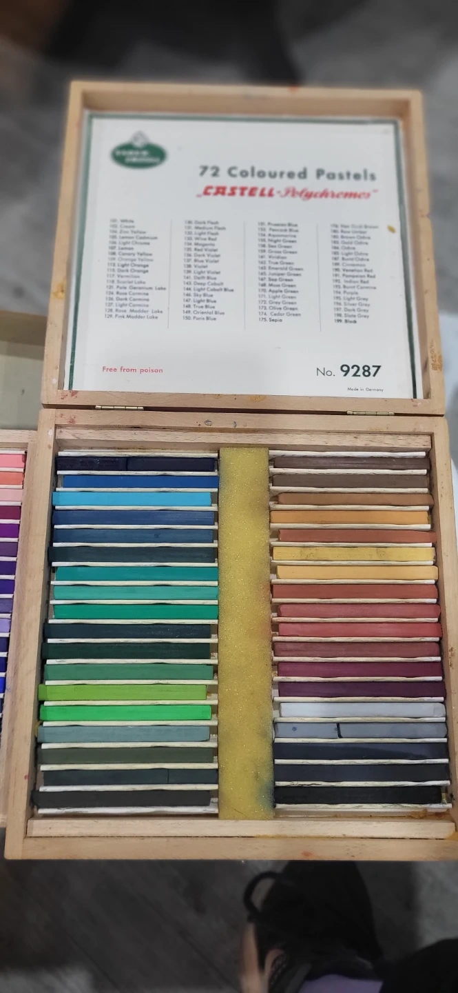 This is a set of 72 coloured pastels by Faber-Castell. The set includes a wide range of colours in a wooden box. Made in Germany.